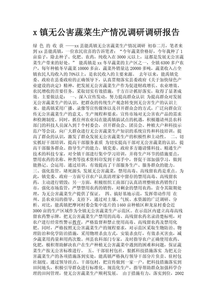 本站资深用户发布了最新的《x镇无公害蔬菜生产情况调研调研报告》文档,以下内容为预览,详细内容可下载阅读。 声明:本站所有文章,如无特殊说明或标注,均为本站原创发布。任何个人或组织,在未征得本站同意时,禁止复制、盗用、采集、发布本站内容到任何网站、书籍等各类媒体平台。如若本站内容侵犯了原著者的合法权益,可联系我们进行处理。