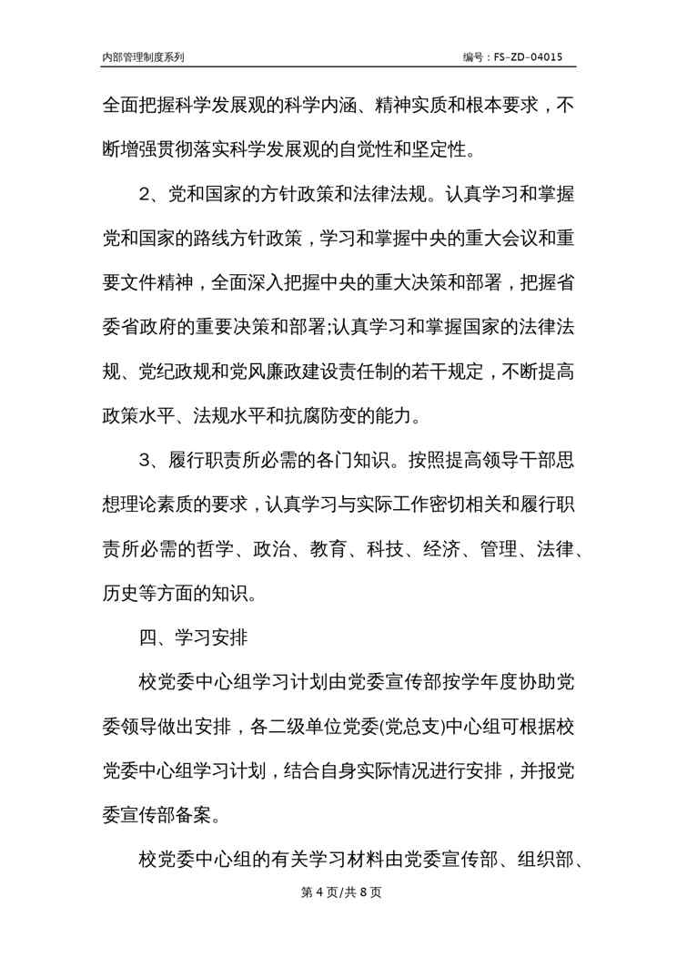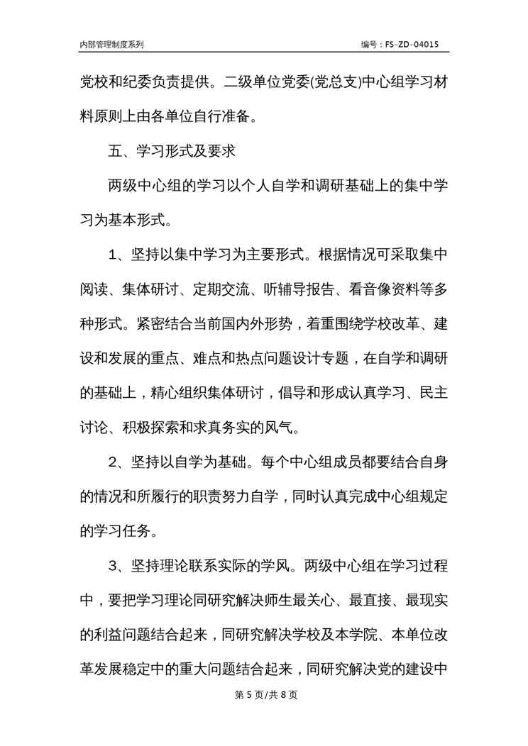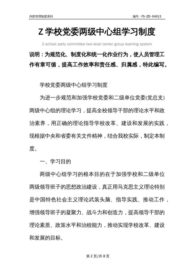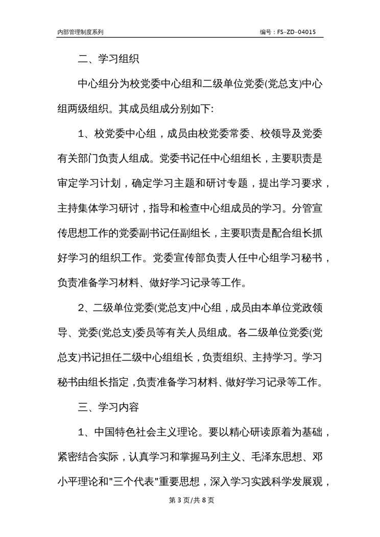 本站资深用户发布了最新的《Z学校党委两级中心组学习管理制度范本》文档,以下内容为预览,详细内容可下载阅读。 声明:本站所有文章,如无特殊说明或标注,均为本站原创发布。任何个人或组织,在未征得本站同意时,禁止复制、盗用、采集、发布本站内容到任何网站、书籍等各类媒体平台。如若本站内容侵犯了原著者的合法权益,可联系我们进行处理。