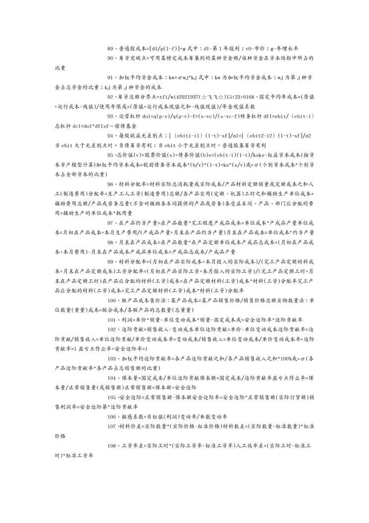 本站资深用户发布了最新的《(财务知识)财务公式》文档,以下内容为预览,详细内容可下载阅读。 声明:本站所有文章,如无特殊说明或标注,均为本站原创发布。任何个人或组织,在未征得本站同意时,禁止复制、盗用、采集、发布本站内容到任何网站、书籍等各类媒体平台。如若本站内容侵犯了原著者的合法权益,可联系我们进行处理。