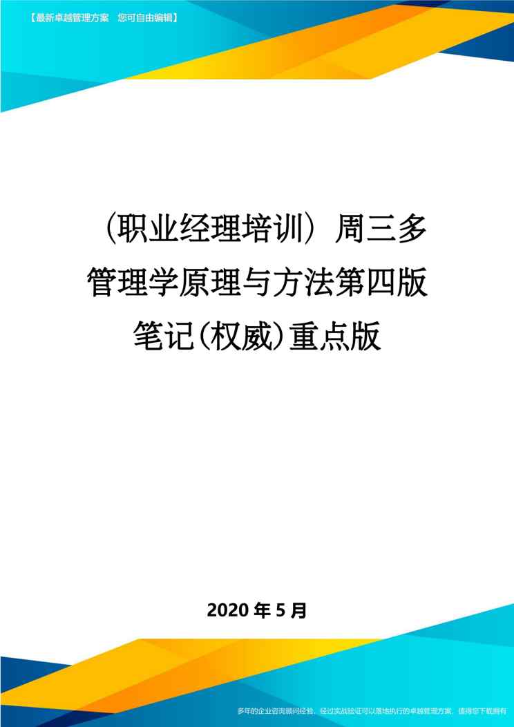 本站资深用户发布了最新的《(职业经理培训)周三多管理学原理与方法第四版笔记(权威)重点版》文档,以下内容为预览,详细内容可下载阅读。 声明:本站所有文章,如无特殊说明或标注,均为本站原创发布。任何个人或组织,在未征得本站同意时,禁止复制、盗用、采集、发布本站内容到任何网站、书籍等各类媒体平台。如若本站内容侵犯了原著者的合法权益,可联系我们进行处理。