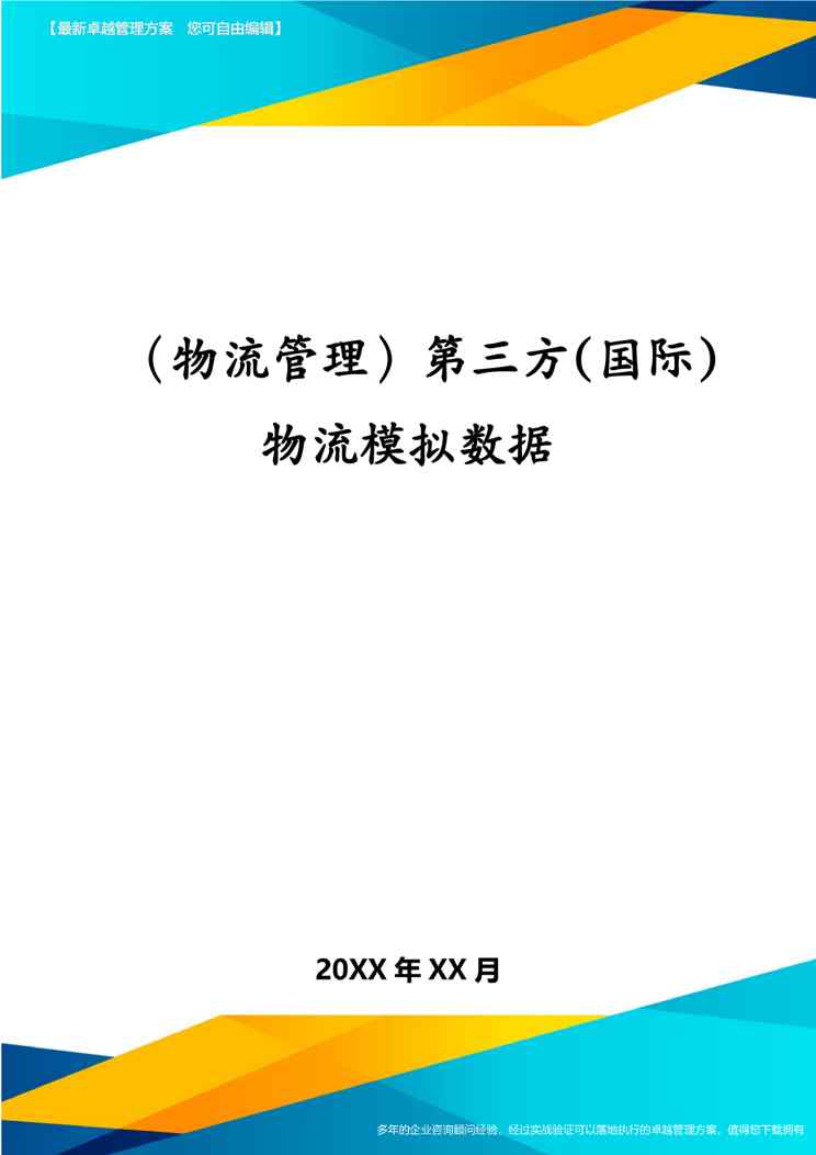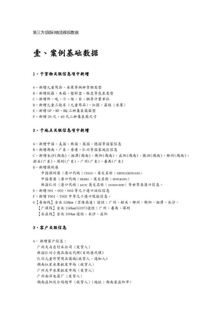 本站资深用户发布了最新的《(物流管理)第三方(国际)物流模拟数据》文档,以下内容为预览,详细内容可下载阅读。 声明:本站所有文章,如无特殊说明或标注,均为本站原创发布。任何个人或组织,在未征得本站同意时,禁止复制、盗用、采集、发布本站内容到任何网站、书籍等各类媒体平台。如若本站内容侵犯了原著者的合法权益,可联系我们进行处理。