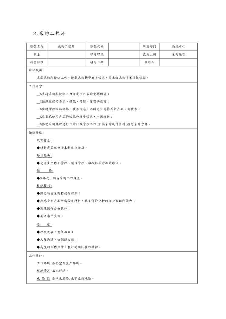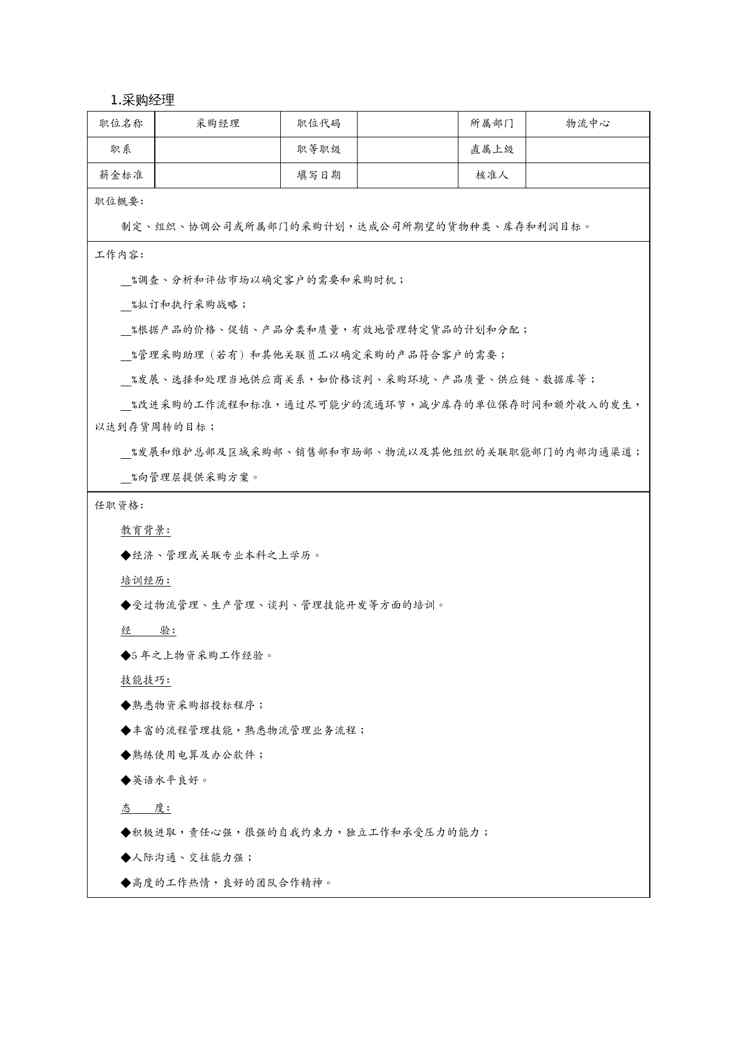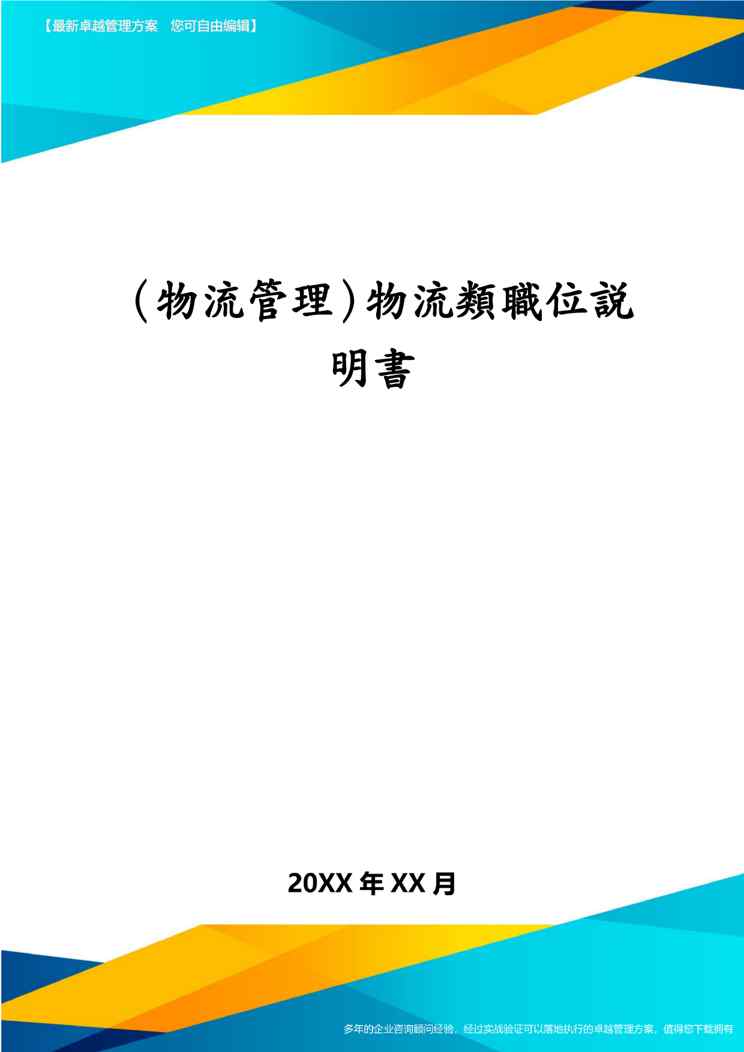 本站资深用户发布了最新的《(物流管理)物流類職位說明書》文档,以下内容为预览,详细内容可下载阅读。 声明:本站所有文章,如无特殊说明或标注,均为本站原创发布。任何个人或组织,在未征得本站同意时,禁止复制、盗用、采集、发布本站内容到任何网站、书籍等各类媒体平台。如若本站内容侵犯了原著者的合法权益,可联系我们进行处理。