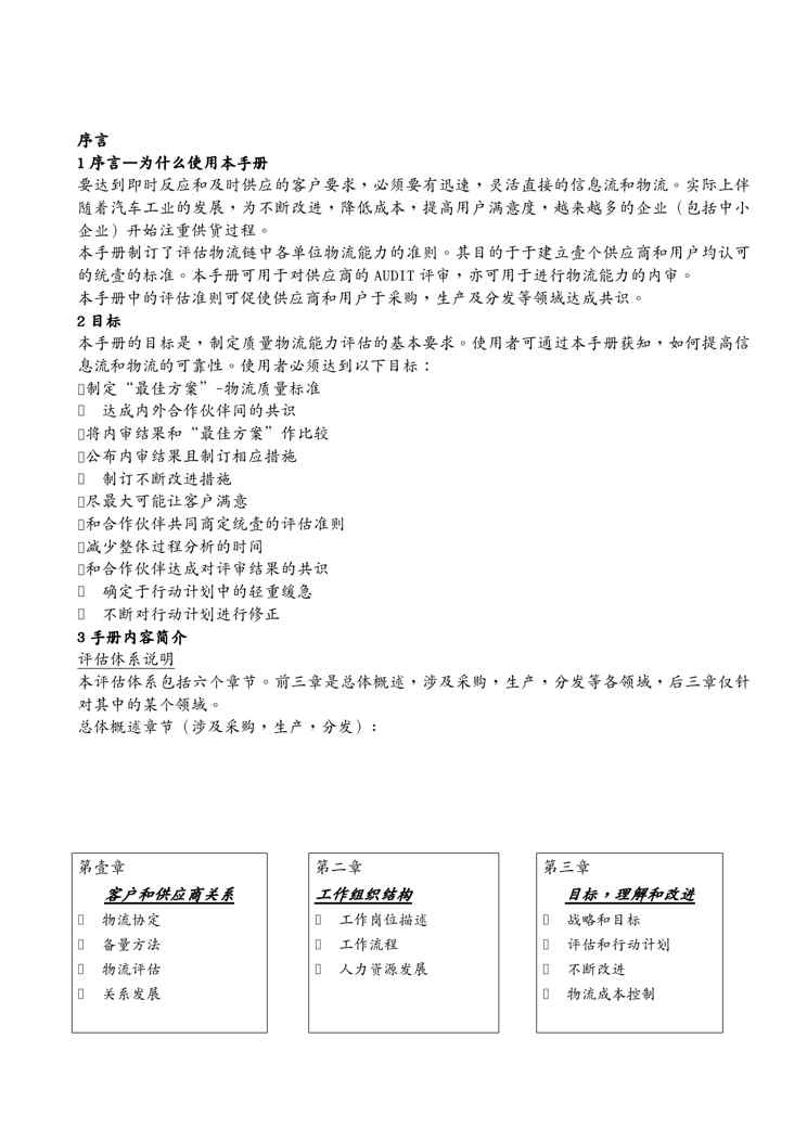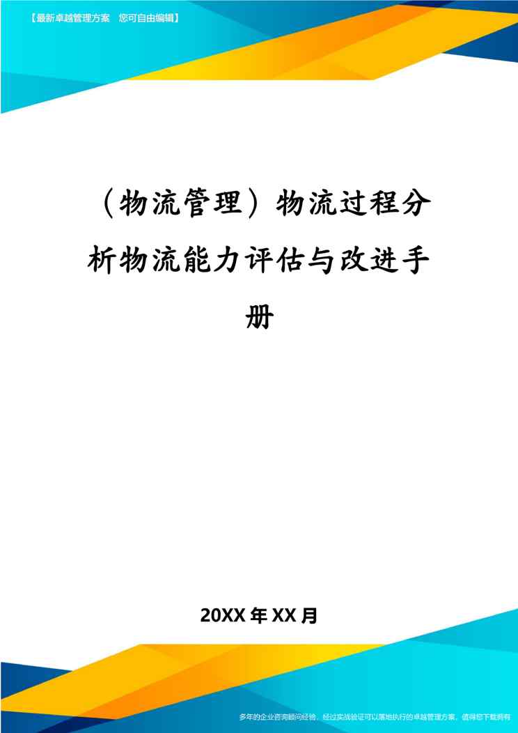 本站资深用户发布了最新的《(物流管理)物流过程分析物流能力评估与改进手册》文档,以下内容为预览,详细内容可下载阅读。 声明:本站所有文章,如无特殊说明或标注,均为本站原创发布。任何个人或组织,在未征得本站同意时,禁止复制、盗用、采集、发布本站内容到任何网站、书籍等各类媒体平台。如若本站内容侵犯了原著者的合法权益,可联系我们进行处理。
