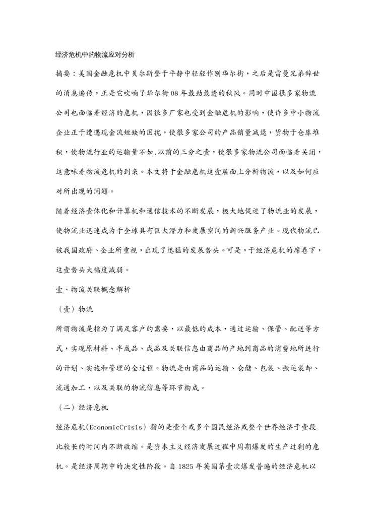 本站正式发布了《(物流管理)经济危机中的物流应对分析》文档,文档详细内容可下载阅读。 声明:本站所有文章,如无特殊说明或标注,均为本站原创发布。任何个人或组织,在未征得本站同意时,禁止复制、盗用、采集、发布本站内容到任何网站、书籍等各类媒体平台。如若本站内容侵犯了原著者的合法权益,可联系我们进行处理。