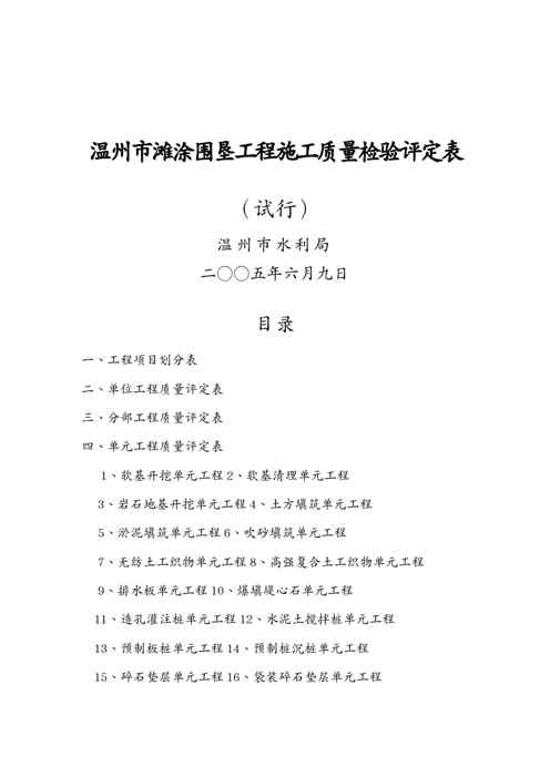 本站正式发布了《{品质管理制度表格}温州市滩涂围垦工程施工质量检验评定表》文档,文档详细内容可下载阅读。 声明:本站所有文章,如无特殊说明或标注,均为本站原创发布。任何个人或组织,在未征得本站同意时,禁止复制、盗用、采集、发布本站内容到任何网站、书籍等各类媒体平台。如若本站内容侵犯了原著者的合法权益,可联系我们进行处理。