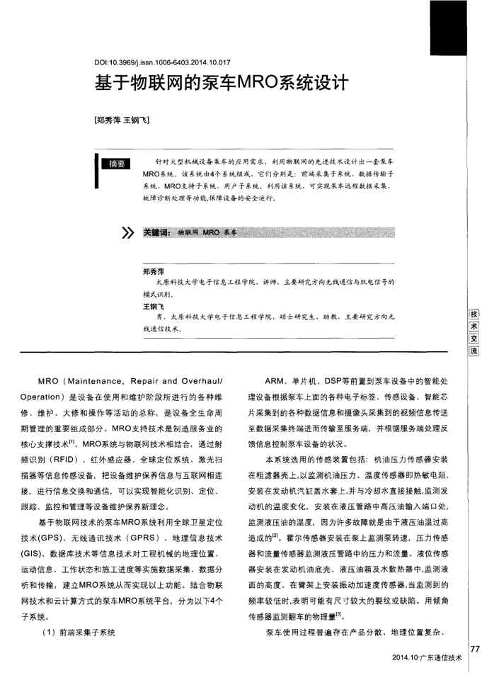 本站资深用户发布了最新的《基于物联网的泵车MRO系统设计》文档,以下内容为预览,详细内容可下载阅读。 声明:本站所有文章,如无特殊说明或标注,均为本站原创发布。任何个人或组织,在未征得本站同意时,禁止复制、盗用、采集、发布本站内容到任何网站、书籍等各类媒体平台。如若本站内容侵犯了原著者的合法权益,可联系我们进行处理。
