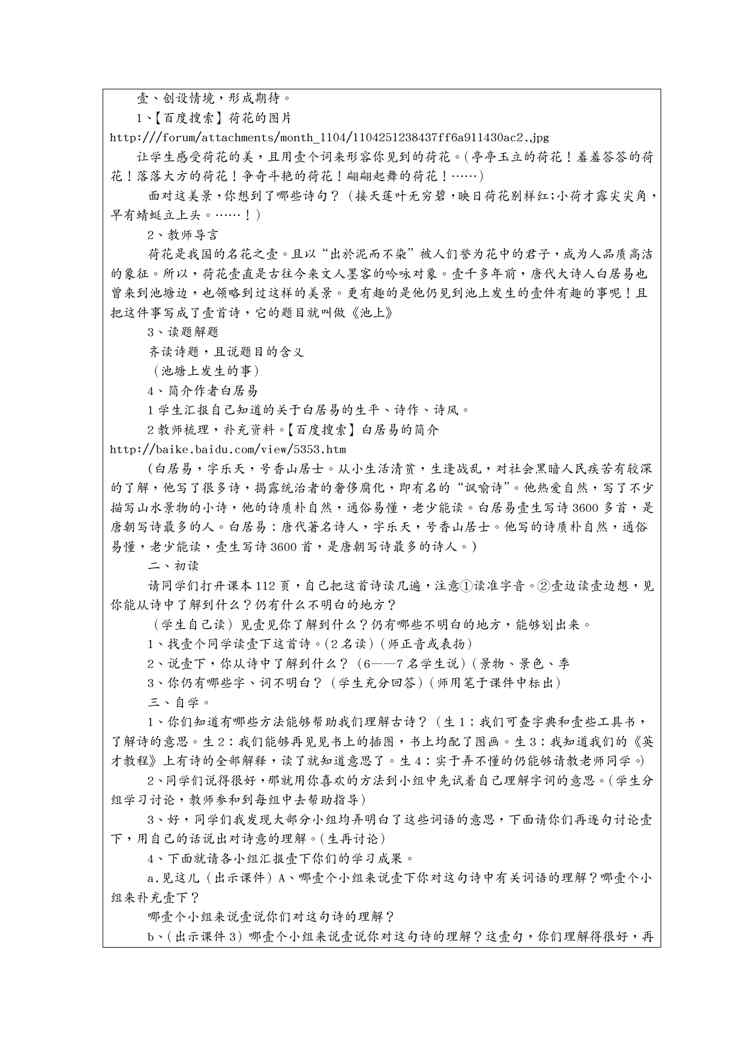 本站资深用户发布了最新的《(物联网)全国中小学教学中的互联网搜索优秀教学案例评选小池教案设计》文档,以下内容为预览,详细内容可下载阅读。 声明:本站所有文章,如无特殊说明或标注,均为本站原创发布。任何个人或组织,在未征得本站同意时,禁止复制、盗用、采集、发布本站内容到任何网站、书籍等各类媒体平台。如若本站内容侵犯了原著者的合法权益,可联系我们进行处理。