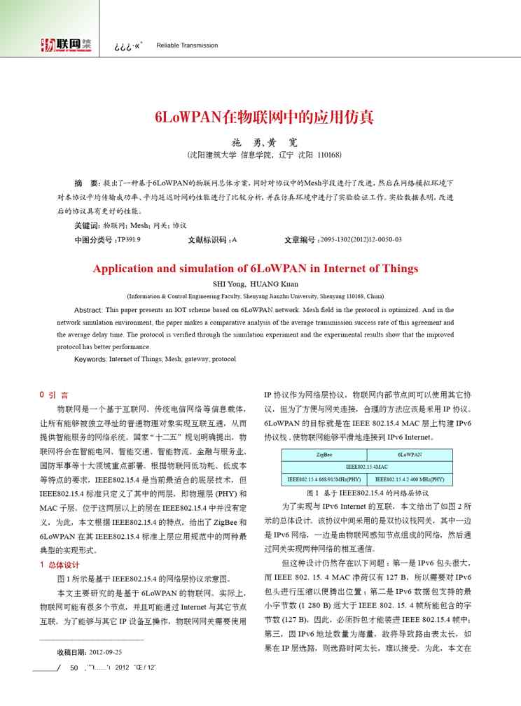 本站资深用户发布了最新的《6LoWPAN在物联网中的应用仿真》文档,以下内容为预览,详细内容可下载阅读。 声明:本站所有文章,如无特殊说明或标注,均为本站原创发布。任何个人或组织,在未征得本站同意时,禁止复制、盗用、采集、发布本站内容到任何网站、书籍等各类媒体平台。如若本站内容侵犯了原著者的合法权益,可联系我们进行处理。