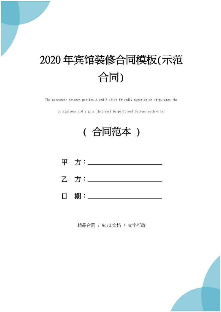 不久前,最新文档《2020年宾馆装修合同模板(示范合同)》全文正式在本站发布,感兴趣的用户可以下载阅读。 声明:本站所有文章,如无特殊说明或标注,均为本站原创发布。任何个人或组织,在未征得本站同意时,禁止复制、盗用、采集、发布本站内容到任何网站、书籍等各类媒体平台。如若本站内容侵犯了原著者的合法权益,可联系我们进行处理。