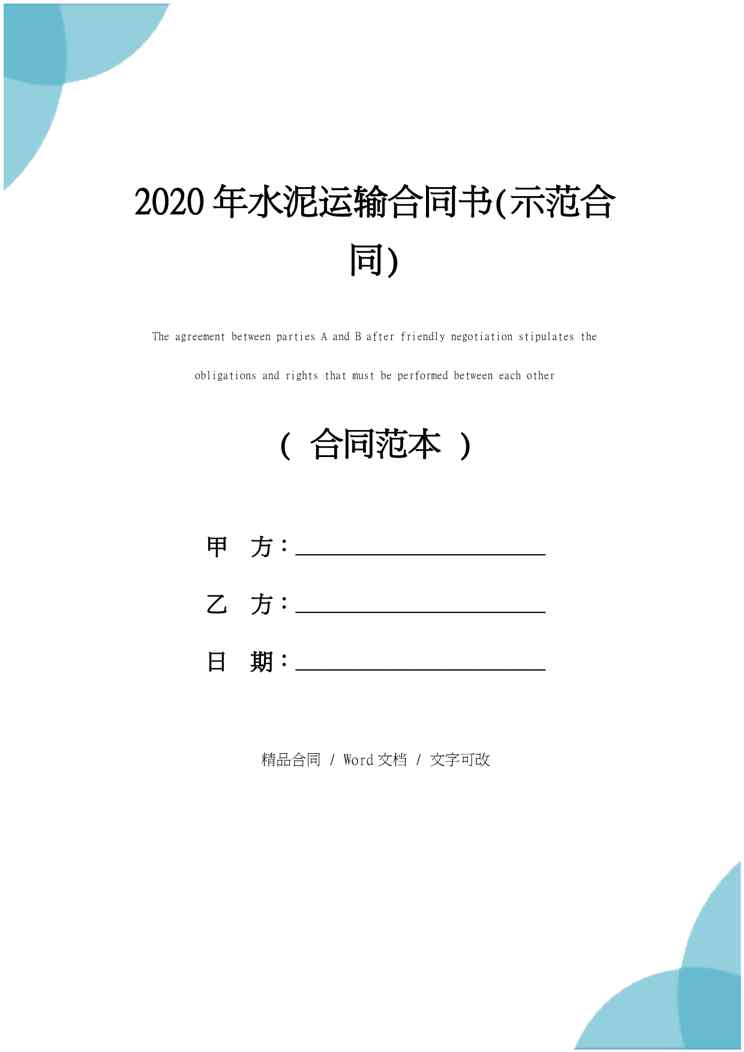 不久前,最新文档《2020年水泥运输合同书(示范合同)》全文正式在本站发布,感兴趣的用户可以下载阅读。 声明:本站所有文章,如无特殊说明或标注,均为本站原创发布。任何个人或组织,在未征得本站同意时,禁止复制、盗用、采集、发布本站内容到任何网站、书籍等各类媒体平台。如若本站内容侵犯了原著者的合法权益,可联系我们进行处理。