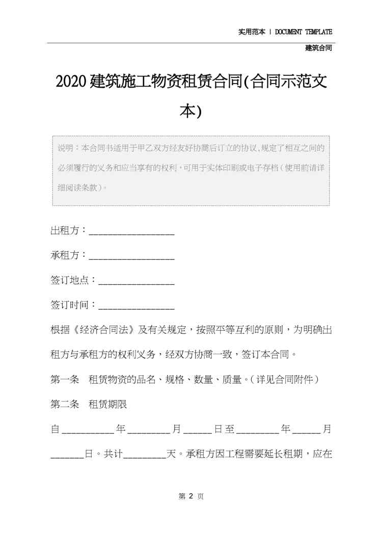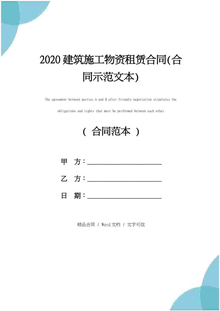 本站正式发布了《2020建筑施工物资租赁合同(合同示范文本)》文档,文档详细内容可下载阅读。 声明:本站所有文章,如无特殊说明或标注,均为本站原创发布。任何个人或组织,在未征得本站同意时,禁止复制、盗用、采集、发布本站内容到任何网站、书籍等各类媒体平台。如若本站内容侵犯了原著者的合法权益,可联系我们进行处理。