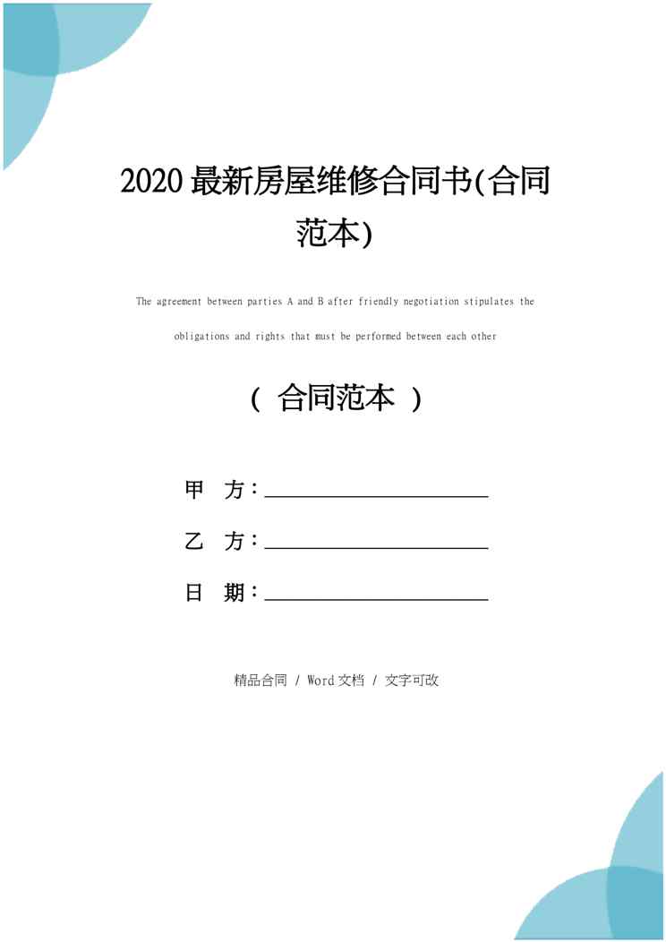 本站正式发布了《2020最新房屋维修合同书(合同范本)》文档,文档详细内容可下载阅读。 声明:本站所有文章,如无特殊说明或标注,均为本站原创发布。任何个人或组织,在未征得本站同意时,禁止复制、盗用、采集、发布本站内容到任何网站、书籍等各类媒体平台。如若本站内容侵犯了原著者的合法权益,可联系我们进行处理。