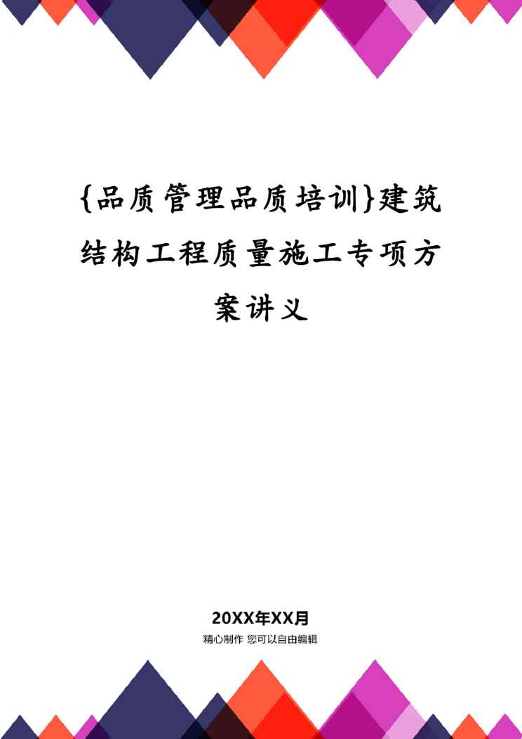 本站资深用户发布了最新的《{品质管理品质培训}建筑结构工程质量施工专项方案讲义》文档,以下内容为预览,详细内容可下载阅读。 声明:本站所有文章,如无特殊说明或标注,均为本站原创发布。任何个人或组织,在未征得本站同意时,禁止复制、盗用、采集、发布本站内容到任何网站、书籍等各类媒体平台。如若本站内容侵犯了原著者的合法权益,可联系我们进行处理。