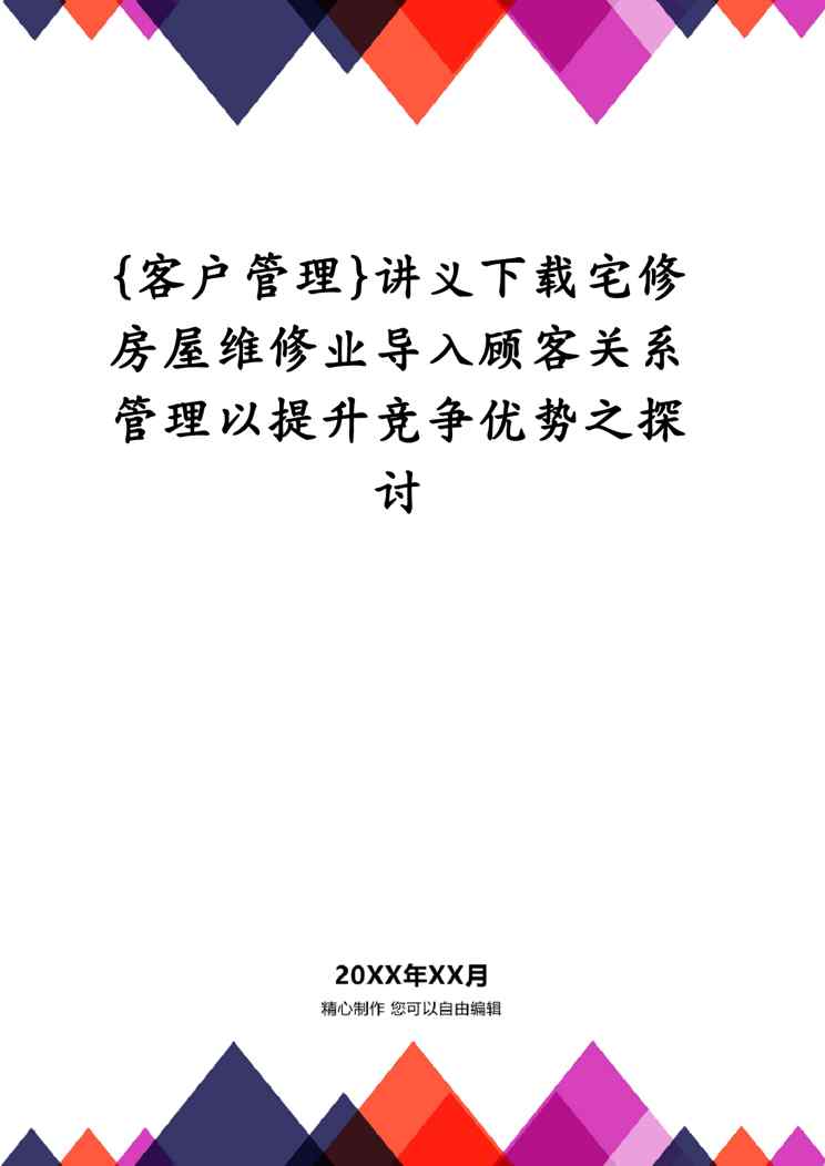 本站正式发布了《{客户管理}讲义下载宅修房屋维修业导入顾客关系管理以提升竞争优势之探讨》文档,文档详细内容可下载阅读。 声明:本站所有文章,如无特殊说明或标注,均为本站原创发布。任何个人或组织,在未征得本站同意时,禁止复制、盗用、采集、发布本站内容到任何网站、书籍等各类媒体平台。如若本站内容侵犯了原著者的合法权益,可联系我们进行处理。