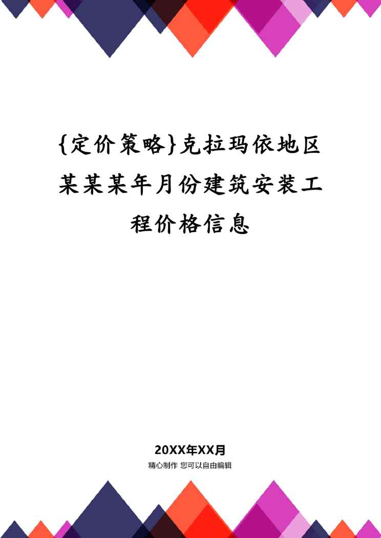 本站资深用户发布了最新的《{定价策略}克拉玛依地区某某某年月份建筑安装工程价格信息》文档,以下内容为预览,详细内容可下载阅读。 声明:本站所有文章,如无特殊说明或标注,均为本站原创发布。任何个人或组织,在未征得本站同意时,禁止复制、盗用、采集、发布本站内容到任何网站、书籍等各类媒体平台。如若本站内容侵犯了原著者的合法权益,可联系我们进行处理。