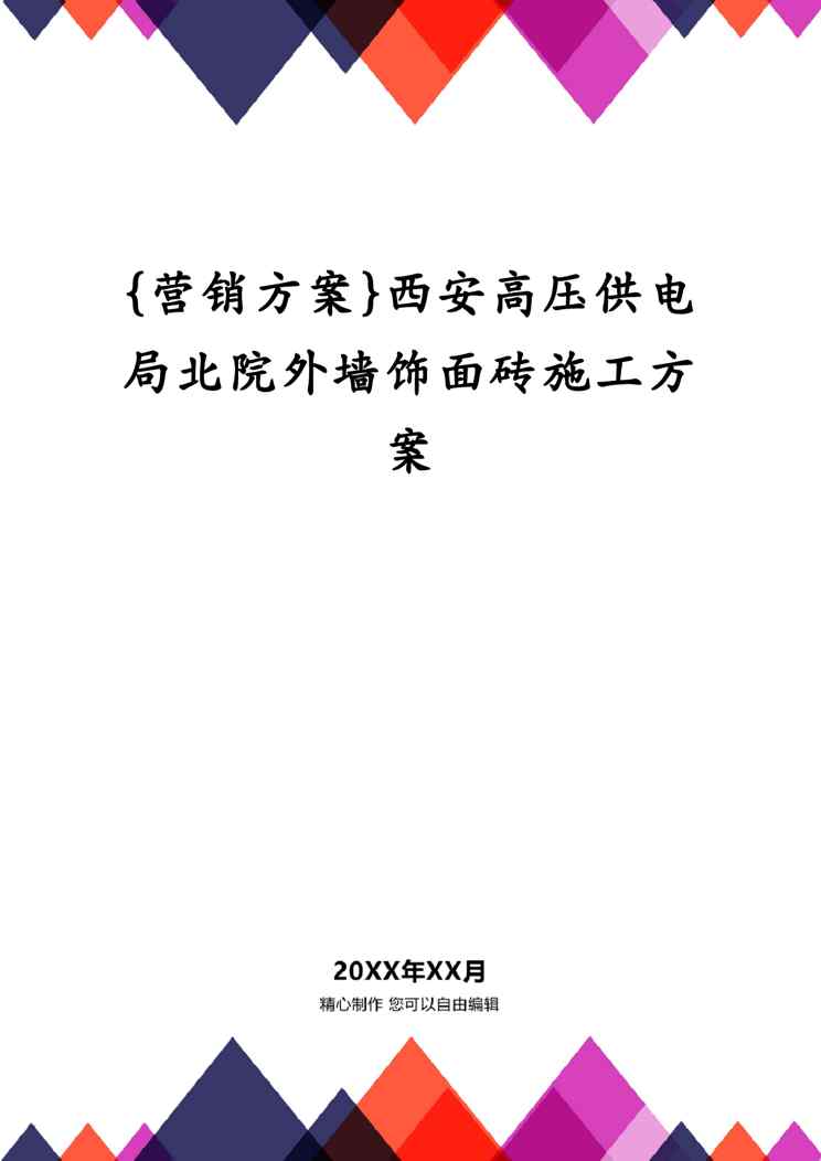 不久前,最新文档《{营销方案}西安高压供电局北院外墙饰面砖施工方案》全文正式在本站发布,感兴趣的用户可以下载阅读。 声明:本站所有文章,如无特殊说明或标注,均为本站原创发布。任何个人或组织,在未征得本站同意时,禁止复制、盗用、采集、发布本站内容到任何网站、书籍等各类媒体平台。如若本站内容侵犯了原著者的合法权益,可联系我们进行处理。