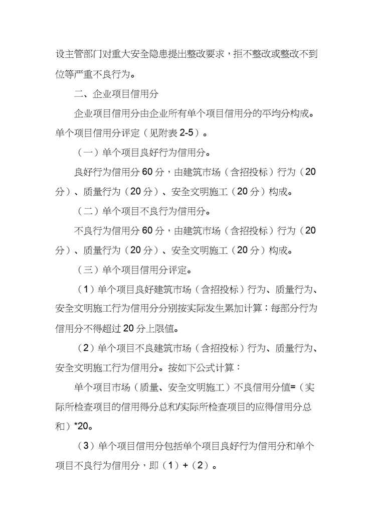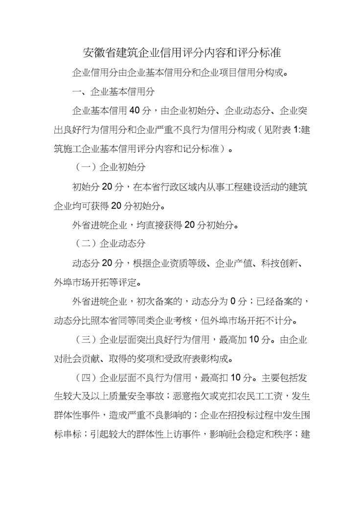 本站资深用户发布了最新的《【财务管理信用管理 】总的某某建筑企业信用评分内容和评分标准》文档,以下内容为预览,详细内容可下载阅读。 声明:本站所有文章,如无特殊说明或标注,均为本站原创发布。任何个人或组织,在未征得本站同意时,禁止复制、盗用、采集、发布本站内容到任何网站、书籍等各类媒体平台。如若本站内容侵犯了原著者的合法权益,可联系我们进行处理。