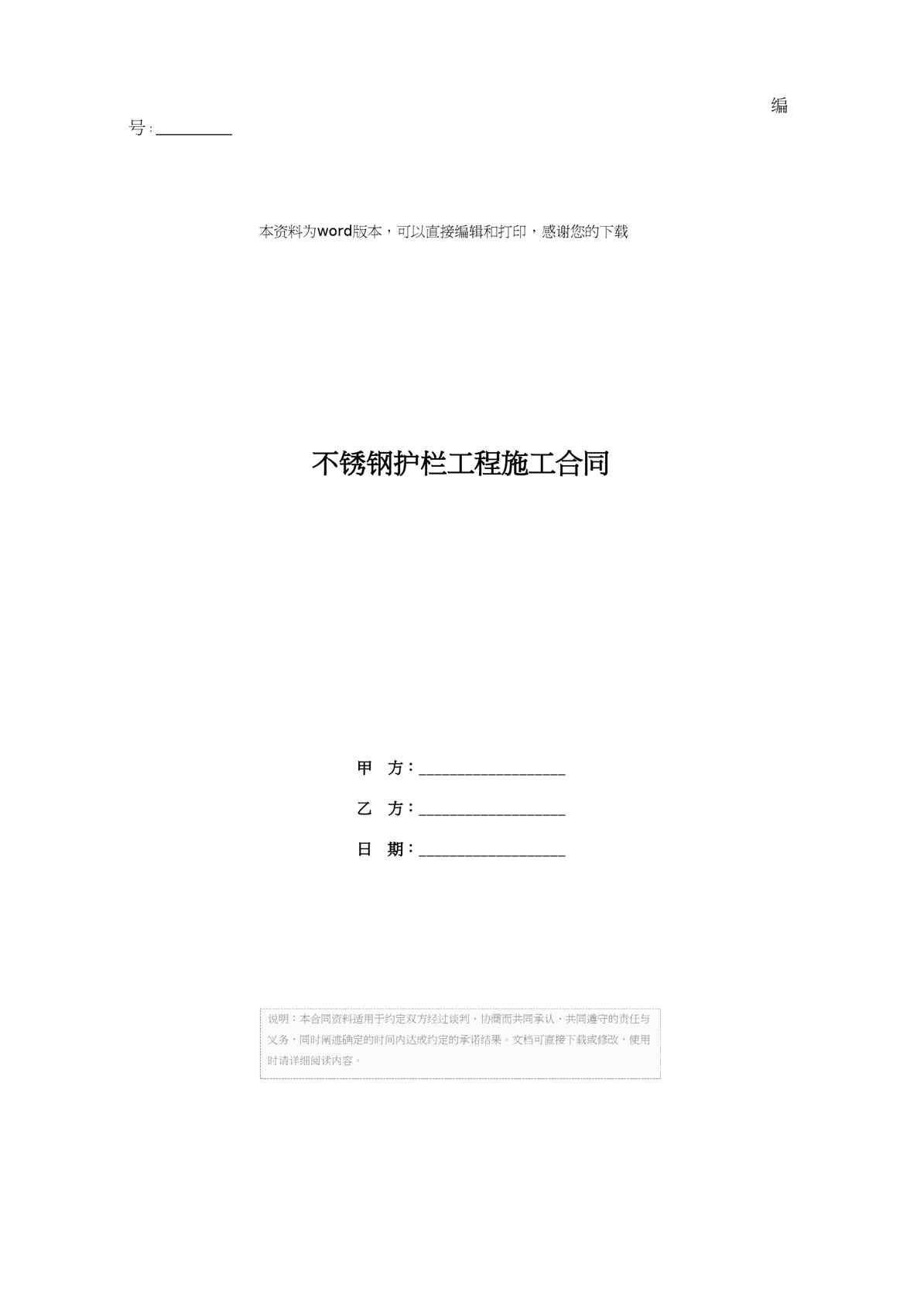 不久前,最新文档《不锈钢护栏工程施工合同》全文正式在本站发布,感兴趣的用户可以下载阅读。 声明:本站所有文章,如无特殊说明或标注,均为本站原创发布。任何个人或组织,在未征得本站同意时,禁止复制、盗用、采集、发布本站内容到任何网站、书籍等各类媒体平台。如若本站内容侵犯了原著者的合法权益,可联系我们进行处理。