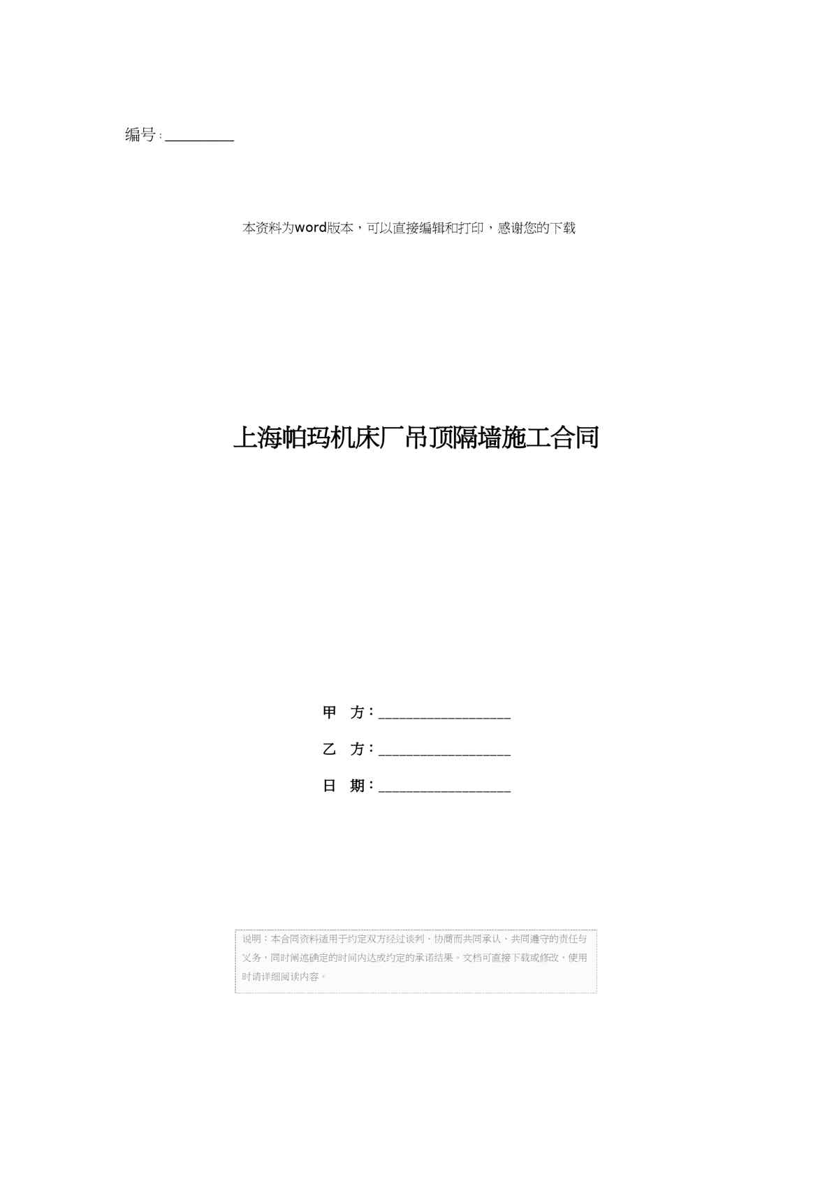 本站正式发布了《上海帕玛机床厂吊顶隔墙施工合同》文档,文档详细内容可下载阅读。 声明:本站所有文章,如无特殊说明或标注,均为本站原创发布。任何个人或组织,在未征得本站同意时,禁止复制、盗用、采集、发布本站内容到任何网站、书籍等各类媒体平台。如若本站内容侵犯了原著者的合法权益,可联系我们进行处理。
