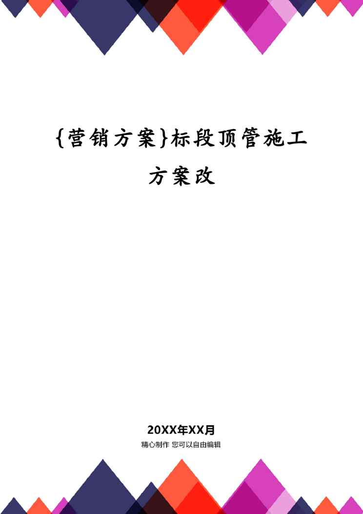 不久前,最新文档《{营销方案}标段顶管施工方案改》全文正式在本站发布,感兴趣的用户可以下载阅读。 声明:本站所有文章,如无特殊说明或标注,均为本站原创发布。任何个人或组织,在未征得本站同意时,禁止复制、盗用、采集、发布本站内容到任何网站、书籍等各类媒体平台。如若本站内容侵犯了原著者的合法权益,可联系我们进行处理。