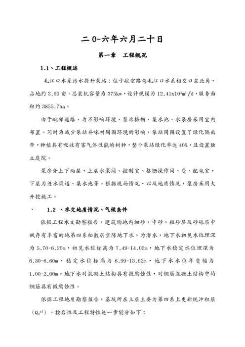 本站资深用户发布了最新的《建筑工程管理毛江口水系污水泵房施工组织设计》文档,以下内容为预览,详细内容可下载阅读。 声明:本站所有文章,如无特殊说明或标注,均为本站原创发布。任何个人或组织,在未征得本站同意时,禁止复制、盗用、采集、发布本站内容到任何网站、书籍等各类媒体平台。如若本站内容侵犯了原著者的合法权益,可联系我们进行处理。