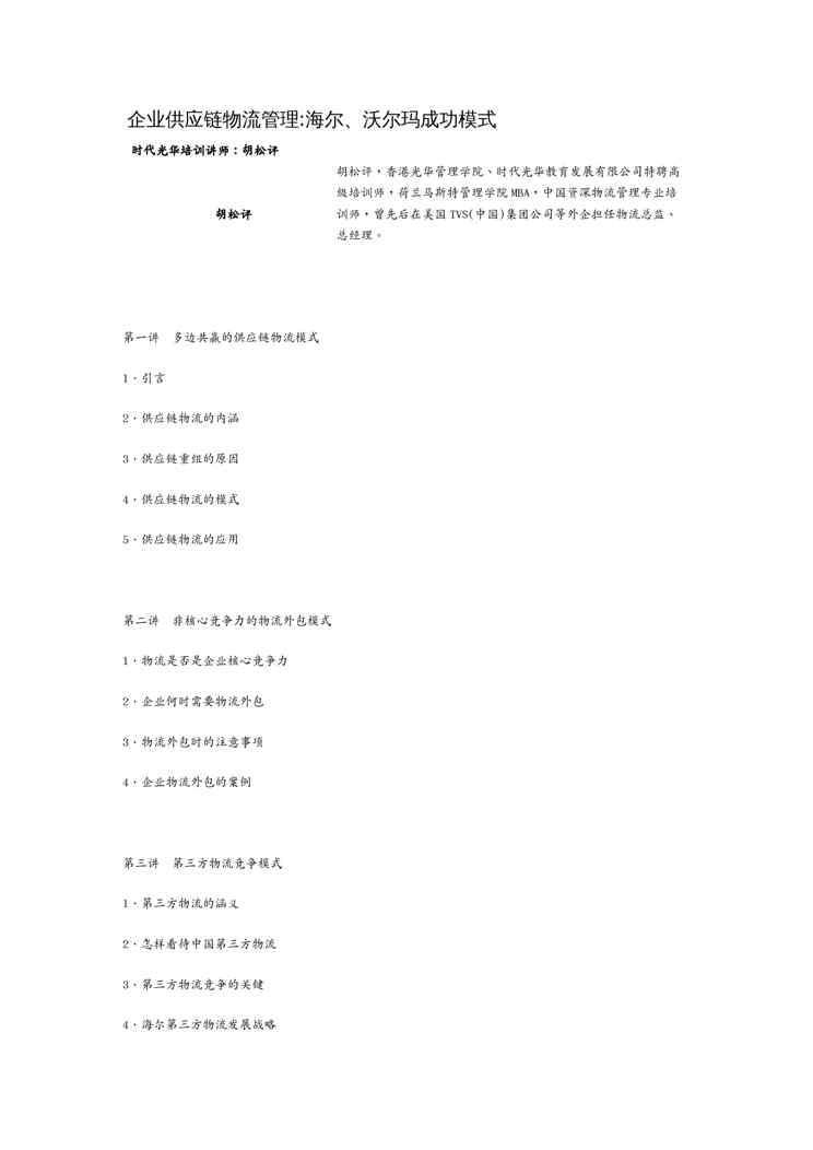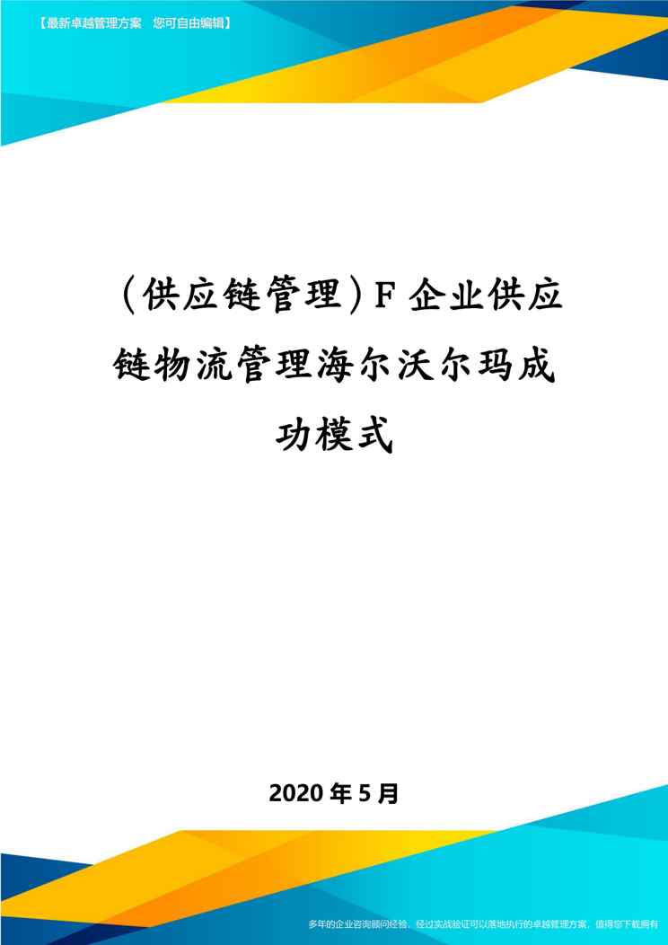 本站资深用户发布了最新的《(供应链管理)F企业供应链物流管理海尔沃尔玛成功模式》文档,以下内容为预览,详细内容可下载阅读。 声明:本站所有文章,如无特殊说明或标注,均为本站原创发布。任何个人或组织,在未征得本站同意时,禁止复制、盗用、采集、发布本站内容到任何网站、书籍等各类媒体平台。如若本站内容侵犯了原著者的合法权益,可联系我们进行处理。