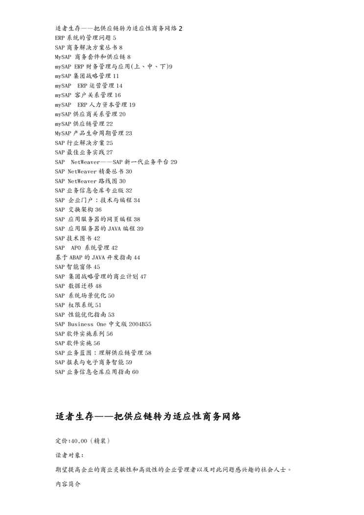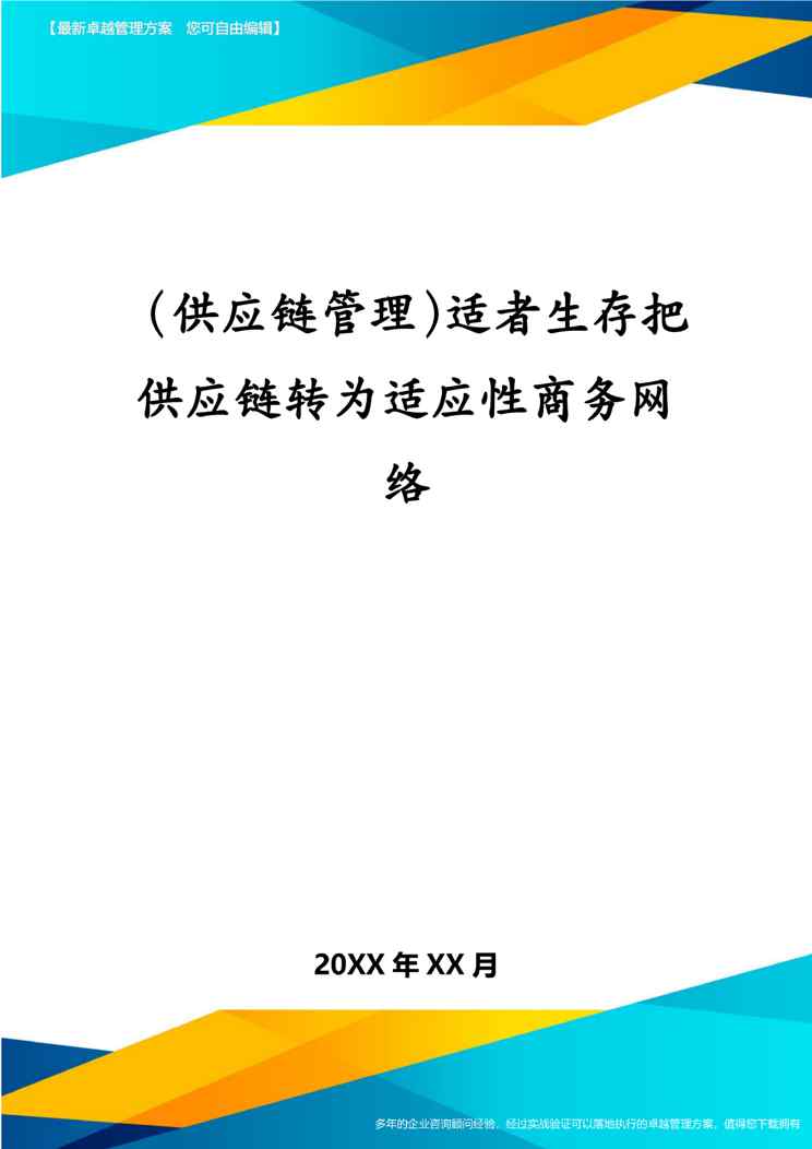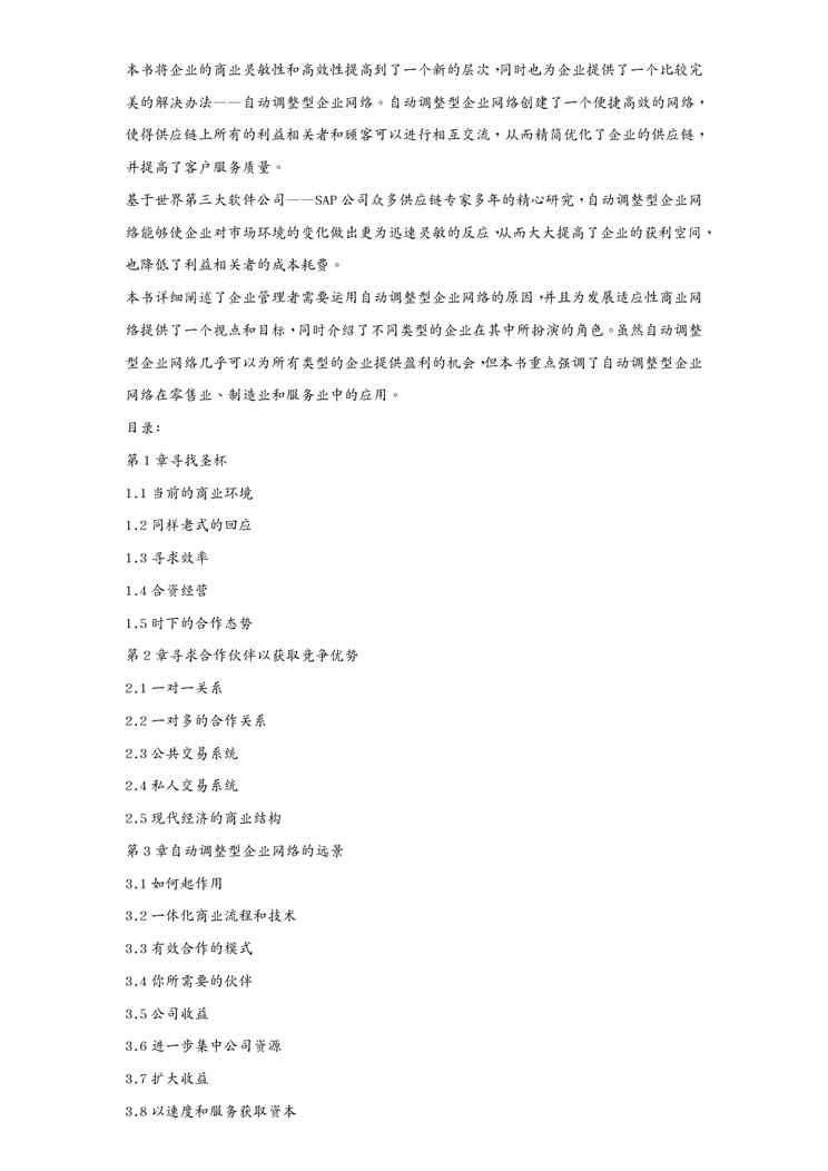 本站资深用户发布了最新的《(供应链管理)适者生存把供应链转为适应性商务网络》文档,以下内容为预览,详细内容可下载阅读。 声明:本站所有文章,如无特殊说明或标注,均为本站原创发布。任何个人或组织,在未征得本站同意时,禁止复制、盗用、采集、发布本站内容到任何网站、书籍等各类媒体平台。如若本站内容侵犯了原著者的合法权益,可联系我们进行处理。
