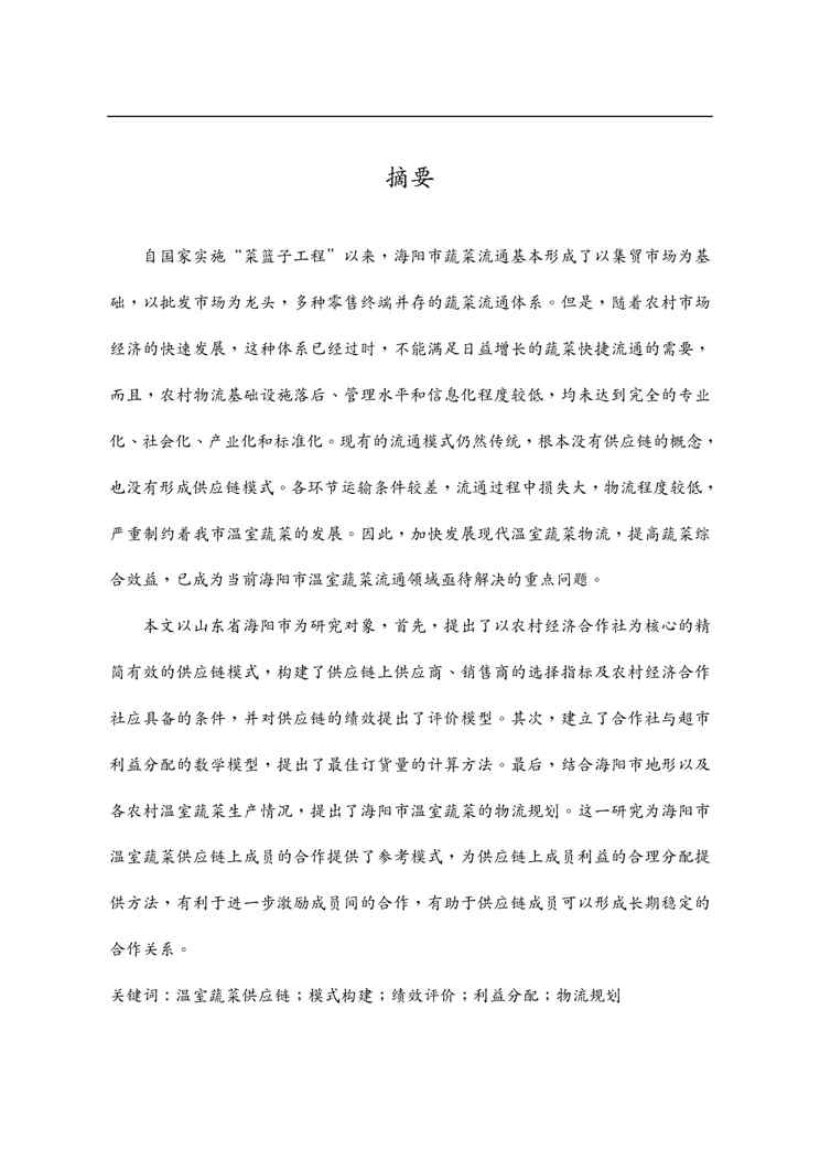 本站正式发布了《(供应链管理)温室蔬菜供应链模式构建的研究》文档,文档详细内容可下载阅读。 声明:本站所有文章,如无特殊说明或标注,均为本站原创发布。任何个人或组织,在未征得本站同意时,禁止复制、盗用、采集、发布本站内容到任何网站、书籍等各类媒体平台。如若本站内容侵犯了原著者的合法权益,可联系我们进行处理。