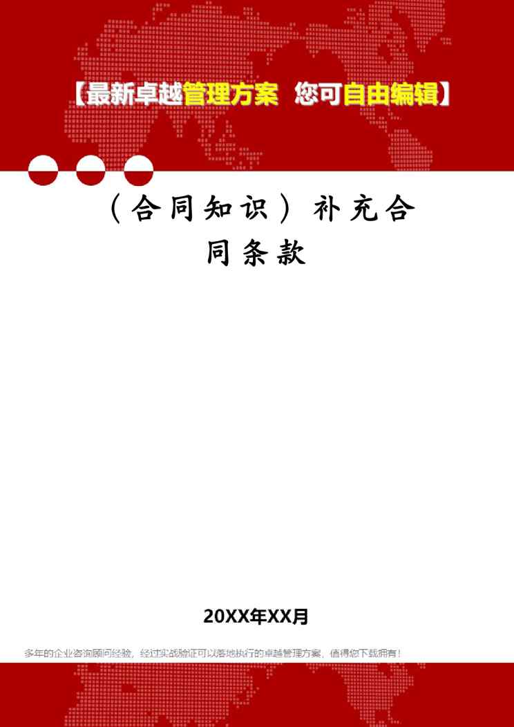 不久前,最新文档《(合同知识)补充合同条款》全文正式在本站发布,感兴趣的用户可以下载阅读。 声明:本站所有文章,如无特殊说明或标注,均为本站原创发布。任何个人或组织,在未征得本站同意时,禁止复制、盗用、采集、发布本站内容到任何网站、书籍等各类媒体平台。如若本站内容侵犯了原著者的合法权益,可联系我们进行处理。