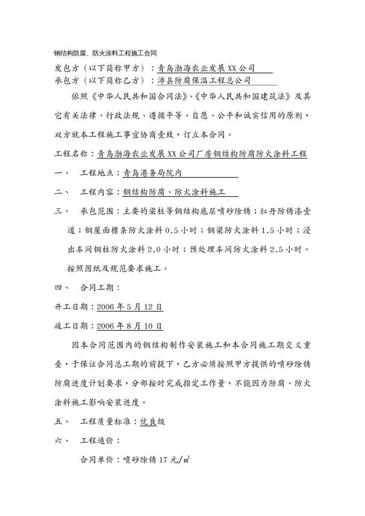 本站资深用户发布了最新的《(合同知识)钢结构防腐合同》文档,以下内容为预览,详细内容可下载阅读。 声明:本站所有文章,如无特殊说明或标注,均为本站原创发布。任何个人或组织,在未征得本站同意时,禁止复制、盗用、采集、发布本站内容到任何网站、书籍等各类媒体平台。如若本站内容侵犯了原著者的合法权益,可联系我们进行处理。