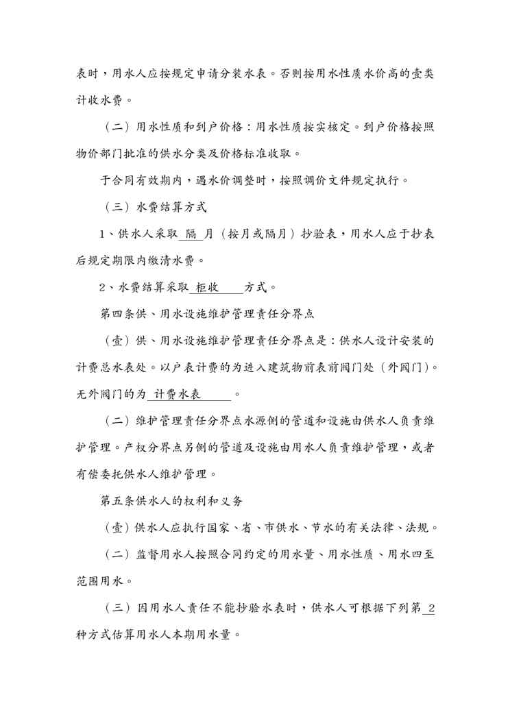 不久前,最新文档《(合同知识)供用水合同》全文正式在本站发布,感兴趣的用户可以下载阅读。 声明:本站所有文章,如无特殊说明或标注,均为本站原创发布。任何个人或组织,在未征得本站同意时,禁止复制、盗用、采集、发布本站内容到任何网站、书籍等各类媒体平台。如若本站内容侵犯了原著者的合法权益,可联系我们进行处理。