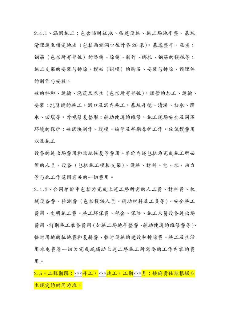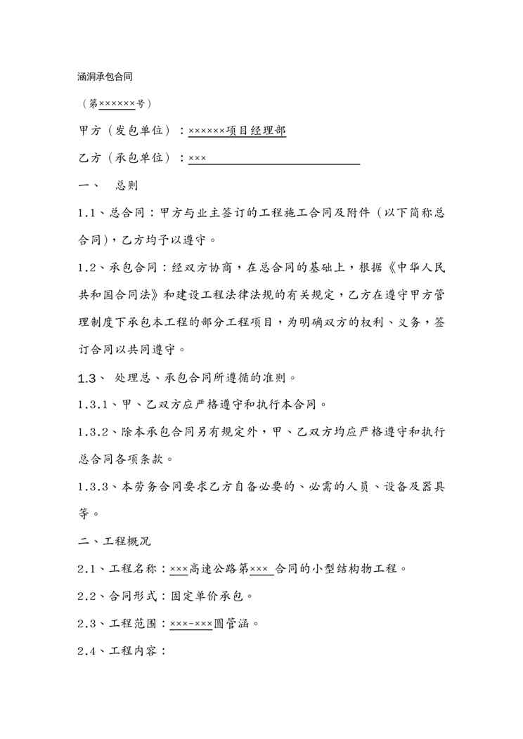 本站资深用户发布了最新的《(合同知识)涵洞承包合同》文档,以下内容为预览,详细内容可下载阅读。 声明:本站所有文章,如无特殊说明或标注,均为本站原创发布。任何个人或组织,在未征得本站同意时,禁止复制、盗用、采集、发布本站内容到任何网站、书籍等各类媒体平台。如若本站内容侵犯了原著者的合法权益,可联系我们进行处理。