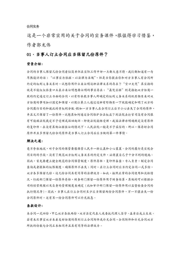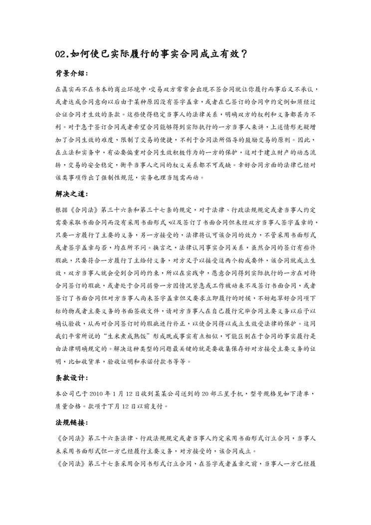 本站资深用户发布了最新的《(合同知识)合同条款实务》文档,以下内容为预览,详细内容可下载阅读。 声明:本站所有文章,如无特殊说明或标注,均为本站原创发布。任何个人或组织,在未征得本站同意时,禁止复制、盗用、采集、发布本站内容到任何网站、书籍等各类媒体平台。如若本站内容侵犯了原著者的合法权益,可联系我们进行处理。