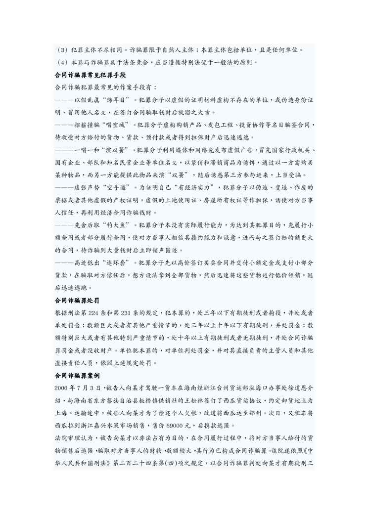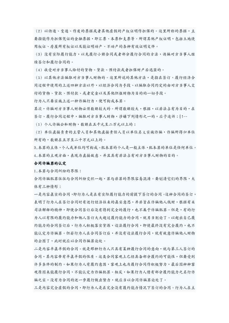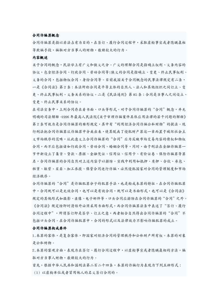 本站正式发布了《(合同知识)合同诈骗罪概念》文档,文档详细内容可下载阅读。 声明:本站所有文章,如无特殊说明或标注,均为本站原创发布。任何个人或组织,在未征得本站同意时,禁止复制、盗用、采集、发布本站内容到任何网站、书籍等各类媒体平台。如若本站内容侵犯了原著者的合法权益,可联系我们进行处理。