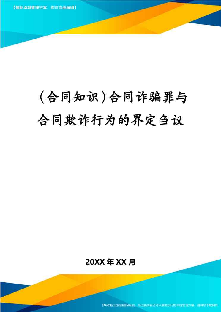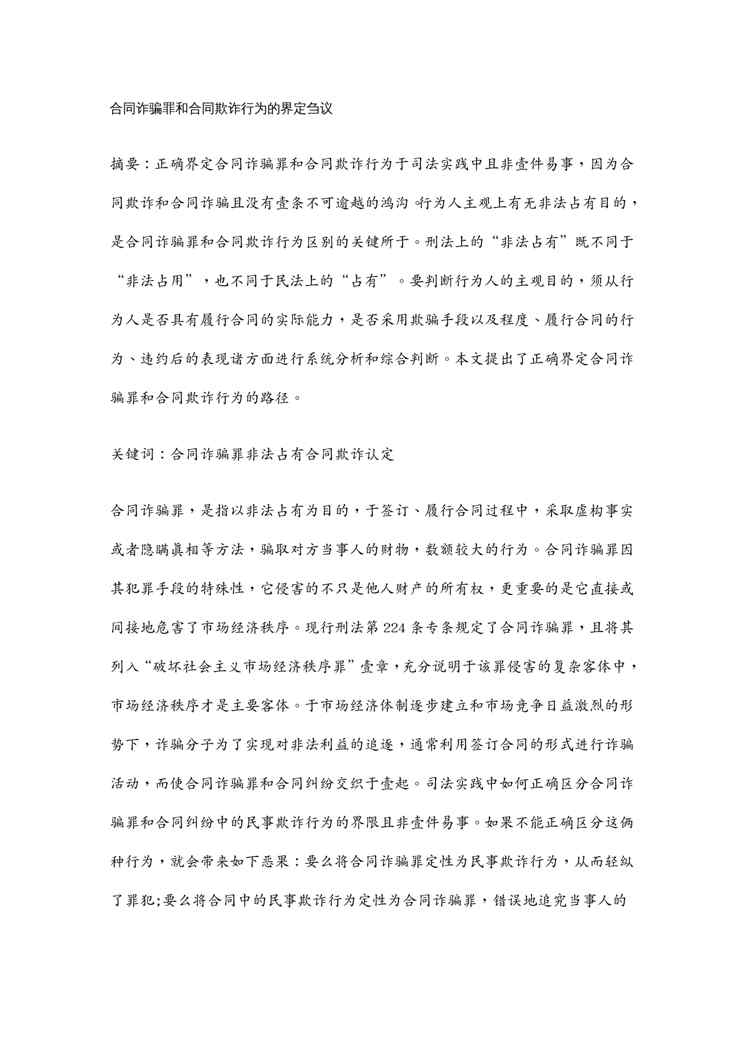 不久前,最新文档《(合同知识)合同诈骗罪与合同欺诈行为的界定刍议》全文正式在本站发布,感兴趣的用户可以下载阅读。 声明:本站所有文章,如无特殊说明或标注,均为本站原创发布。任何个人或组织,在未征得本站同意时,禁止复制、盗用、采集、发布本站内容到任何网站、书籍等各类媒体平台。如若本站内容侵犯了原著者的合法权益,可联系我们进行处理。