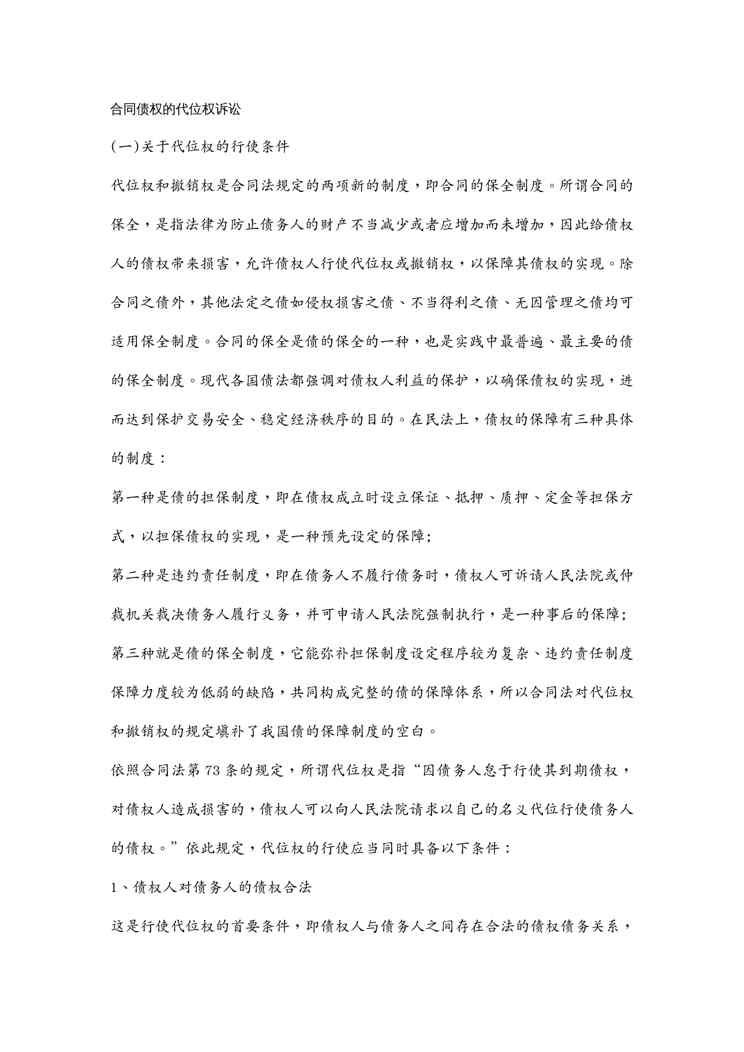 本站资深用户发布了最新的《(合同知识)合同债权的代位权诉讼》文档,以下内容为预览,详细内容可下载阅读。