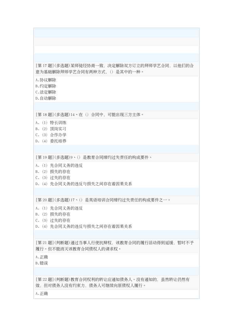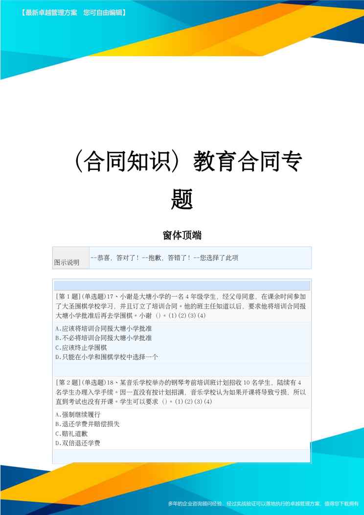 本站资深用户发布了最新的《(合同知识)教育合同专题》文档,以下内容为预览,详细内容可下载阅读。 声明:本站所有文章,如无特殊说明或标注,均为本站原创发布。任何个人或组织,在未征得本站同意时,禁止复制、盗用、采集、发布本站内容到任何网站、书籍等各类媒体平台。如若本站内容侵犯了原著者的合法权益,可联系我们进行处理。