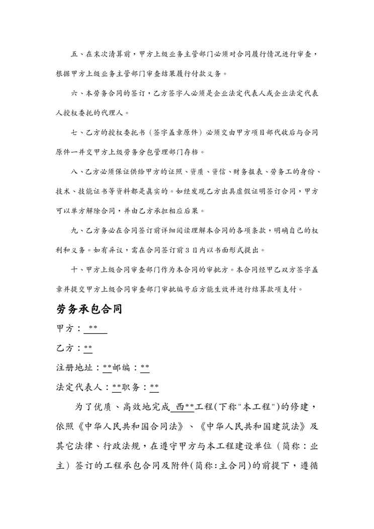 本站资深用户发布了最新的《(合同知识)劳务承包合同》文档,以下内容为预览,详细内容可下载阅读。 声明:本站所有文章,如无特殊说明或标注,均为本站原创发布。任何个人或组织,在未征得本站同意时,禁止复制、盗用、采集、发布本站内容到任何网站、书籍等各类媒体平台。如若本站内容侵犯了原著者的合法权益,可联系我们进行处理。