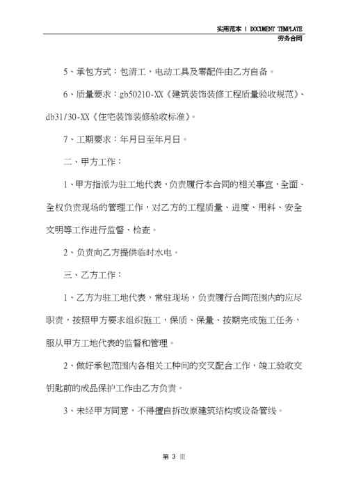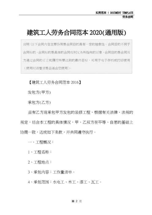 本站资深用户发布了最新的《建筑工人劳务合同范本2020(通用版)》文档,以下内容为预览,详细内容可下载阅读。 声明:本站所有文章,如无特殊说明或标注,均为本站原创发布。任何个人或组织,在未征得本站同意时,禁止复制、盗用、采集、发布本站内容到任何网站、书籍等各类媒体平台。如若本站内容侵犯了原著者的合法权益,可联系我们进行处理。