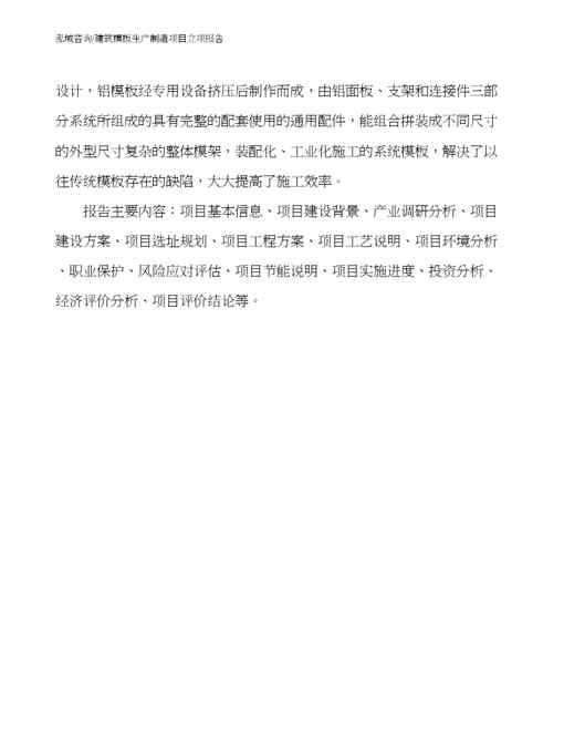 本站资深用户发布了最新的《建筑模板生产制造项目立项报告》文档,以下内容为预览,详细内容可下载阅读。 声明:本站所有文章,如无特殊说明或标注,均为本站原创发布。任何个人或组织,在未征得本站同意时,禁止复制、盗用、采集、发布本站内容到任何网站、书籍等各类媒体平台。如若本站内容侵犯了原著者的合法权益,可联系我们进行处理。