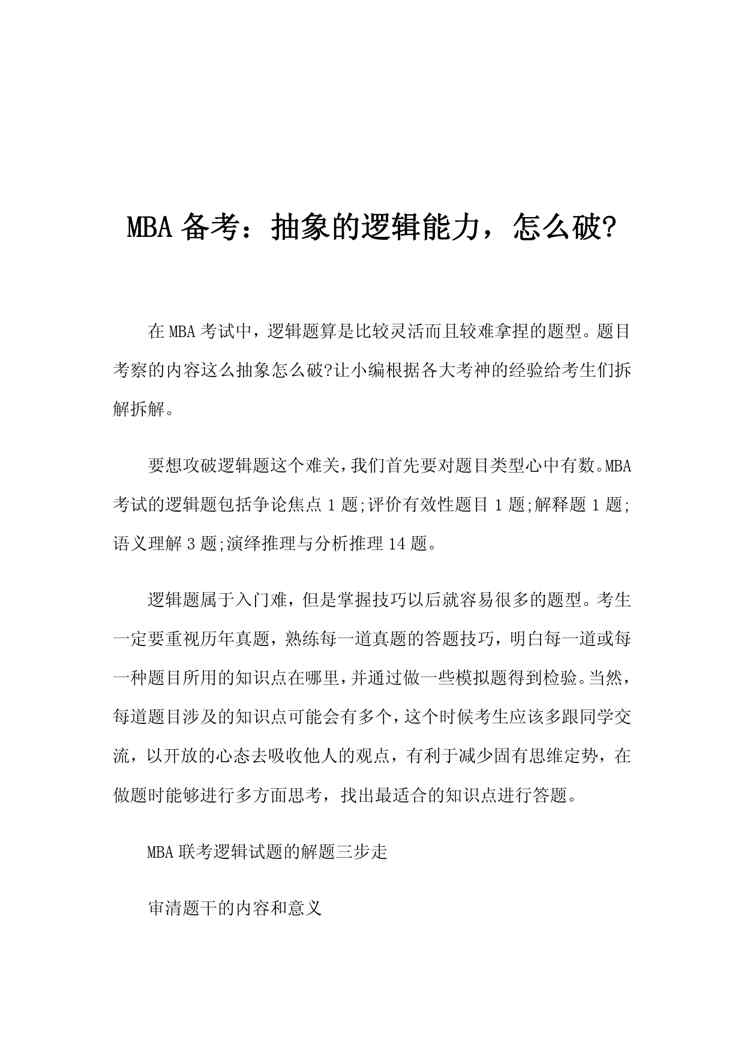 本站正式发布了《MBA备考:抽象的逻辑能力,怎么破》文档,文档详细内容可下载阅读。 声明:本站所有文章,如无特殊说明或标注,均为本站原创发布。任何个人或组织,在未征得本站同意时,禁止复制、盗用、采集、发布本站内容到任何网站、书籍等各类媒体平台。如若本站内容侵犯了原著者的合法权益,可联系我们进行处理。