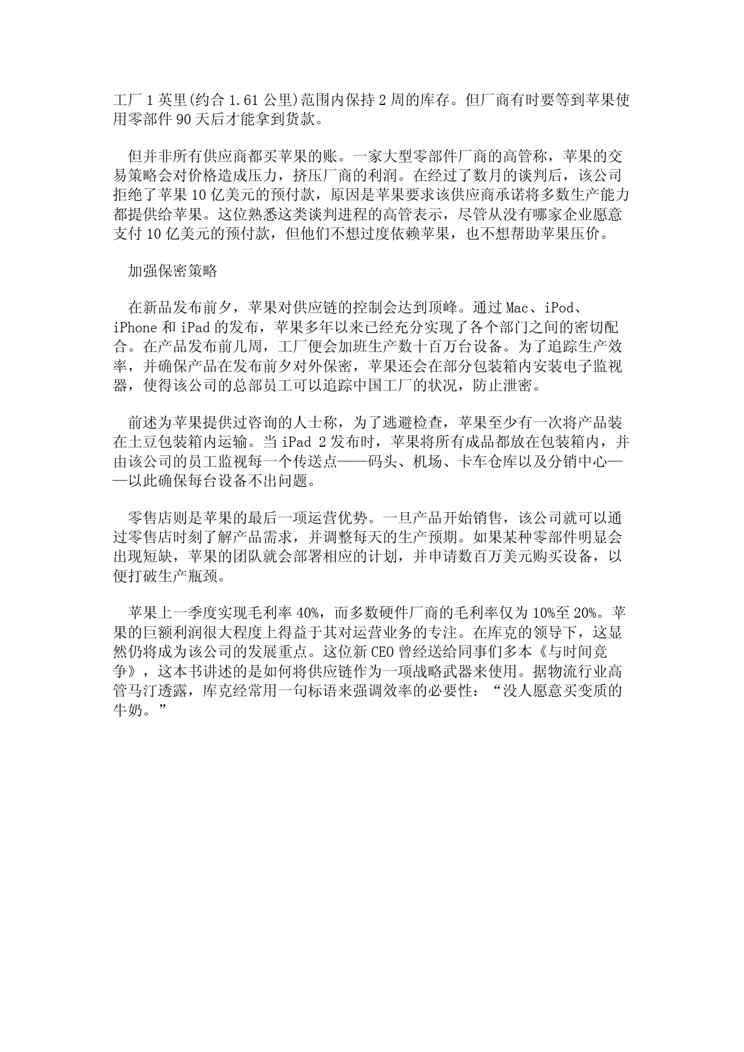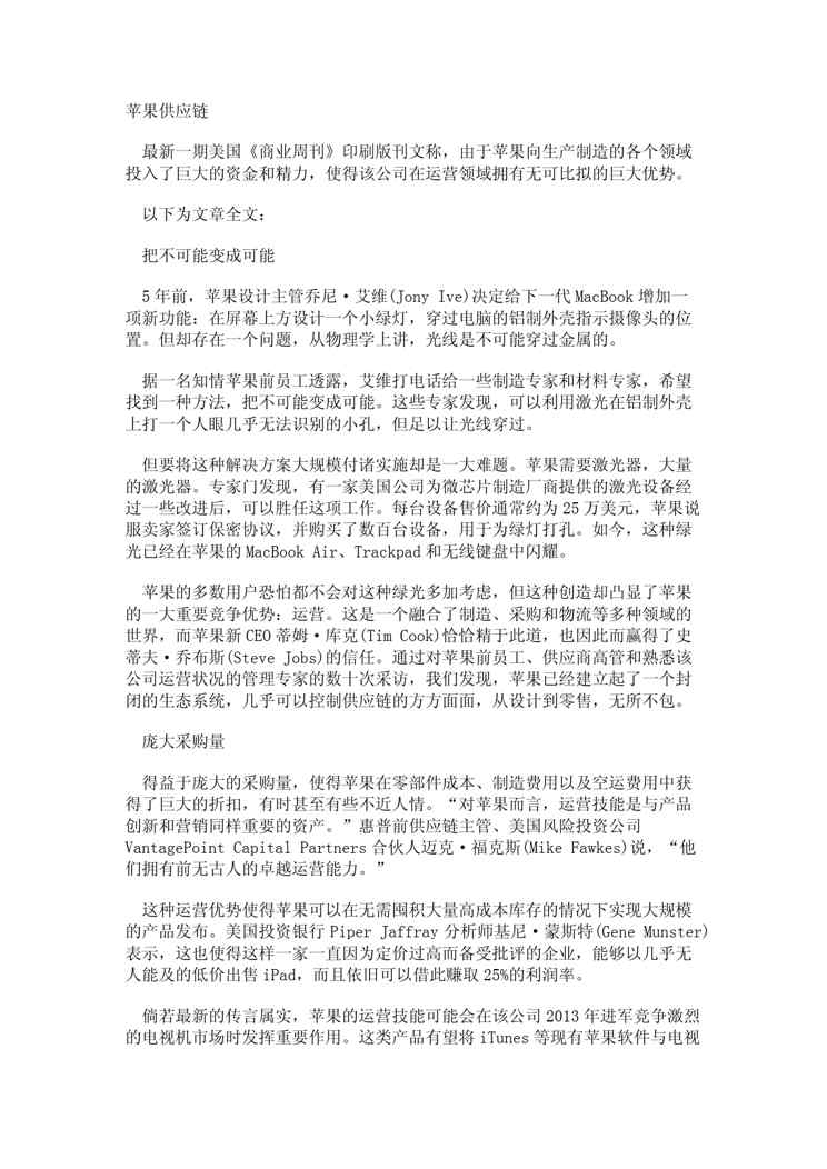本站资深用户发布了最新的《MBA管理案例:苹果供应链》文档,以下内容为预览,详细内容可下载阅读。 声明:本站所有文章,如无特殊说明或标注,均为本站原创发布。任何个人或组织,在未征得本站同意时,禁止复制、盗用、采集、发布本站内容到任何网站、书籍等各类媒体平台。如若本站内容侵犯了原著者的合法权益,可联系我们进行处理。