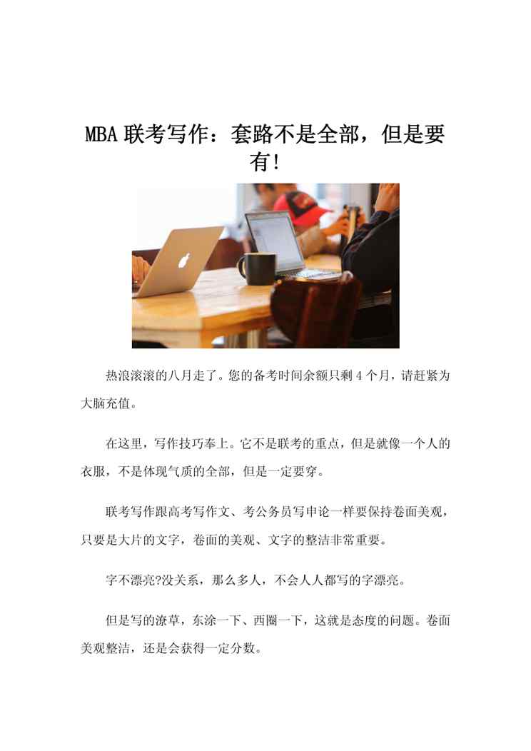 不久前,最新文档《MBA联考写作:套路不是全部,但是要有!》全文正式在本站发布,感兴趣的用户可以下载阅读。 声明:本站所有文章,如无特殊说明或标注,均为本站原创发布。任何个人或组织,在未征得本站同意时,禁止复制、盗用、采集、发布本站内容到任何网站、书籍等各类媒体平台。如若本站内容侵犯了原著者的合法权益,可联系我们进行处理。