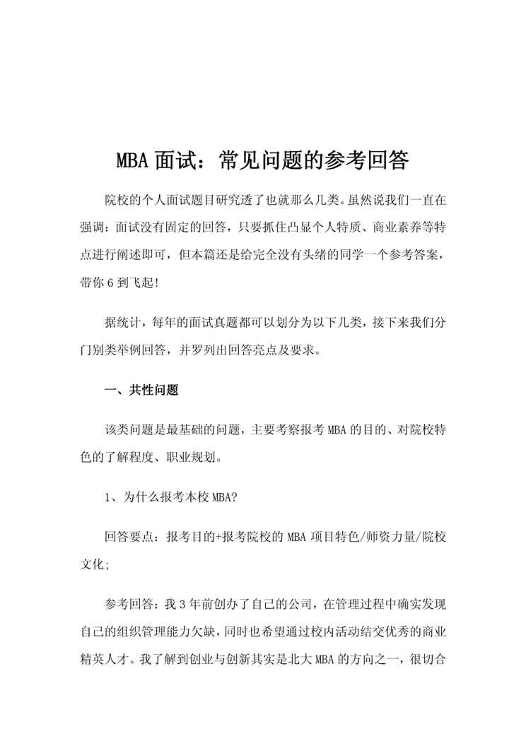 本站正式发布了《MBA面试:常见问题的参考回答》文档,文档详细内容可下载阅读。 声明:本站所有文章,如无特殊说明或标注,均为本站原创发布。任何个人或组织,在未征得本站同意时,禁止复制、盗用、采集、发布本站内容到任何网站、书籍等各类媒体平台。如若本站内容侵犯了原著者的合法权益,可联系我们进行处理。