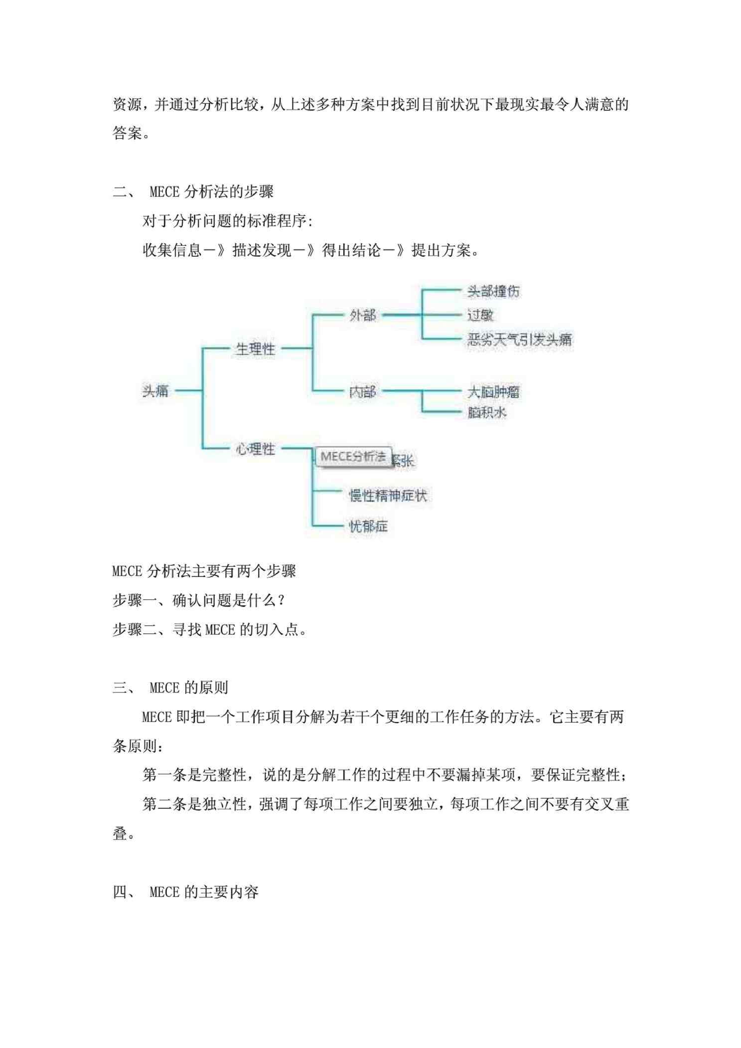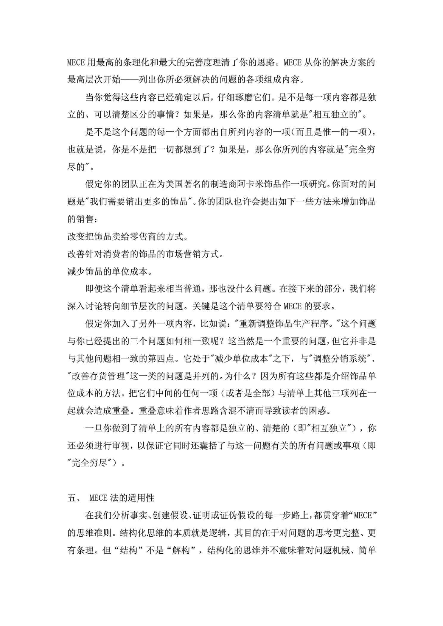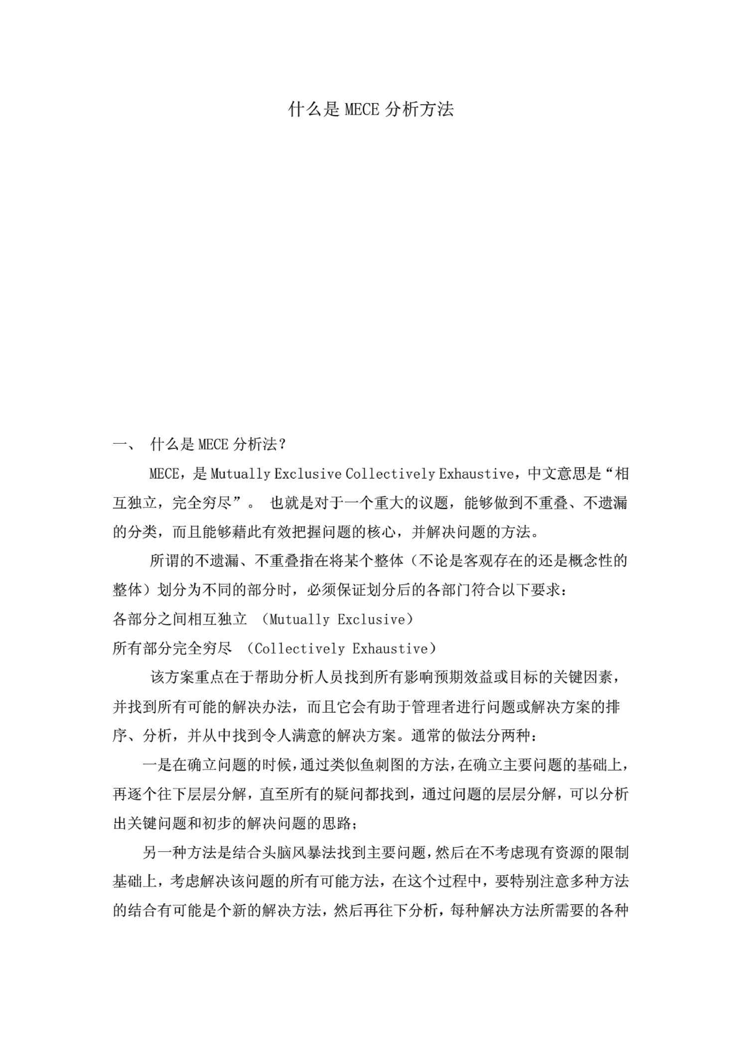本站资深用户发布了最新的《MECE分析方法》文档,以下内容为预览,详细内容可下载阅读。 声明:本站所有文章,如无特殊说明或标注,均为本站原创发布。任何个人或组织,在未征得本站同意时,禁止复制、盗用、采集、发布本站内容到任何网站、书籍等各类媒体平台。如若本站内容侵犯了原著者的合法权益,可联系我们进行处理。