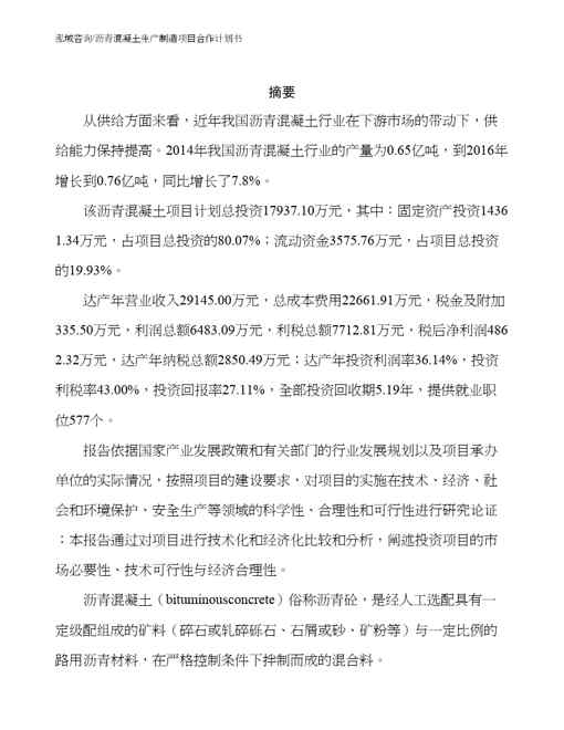 本站资深用户发布了最新的《沥青混凝土生产制造项目合作计划书》文档,以下内容为预览,详细内容可下载阅读。 声明:本站所有文章,如无特殊说明或标注,均为本站原创发布。任何个人或组织,在未征得本站同意时,禁止复制、盗用、采集、发布本站内容到任何网站、书籍等各类媒体平台。如若本站内容侵犯了原著者的合法权益,可联系我们进行处理。