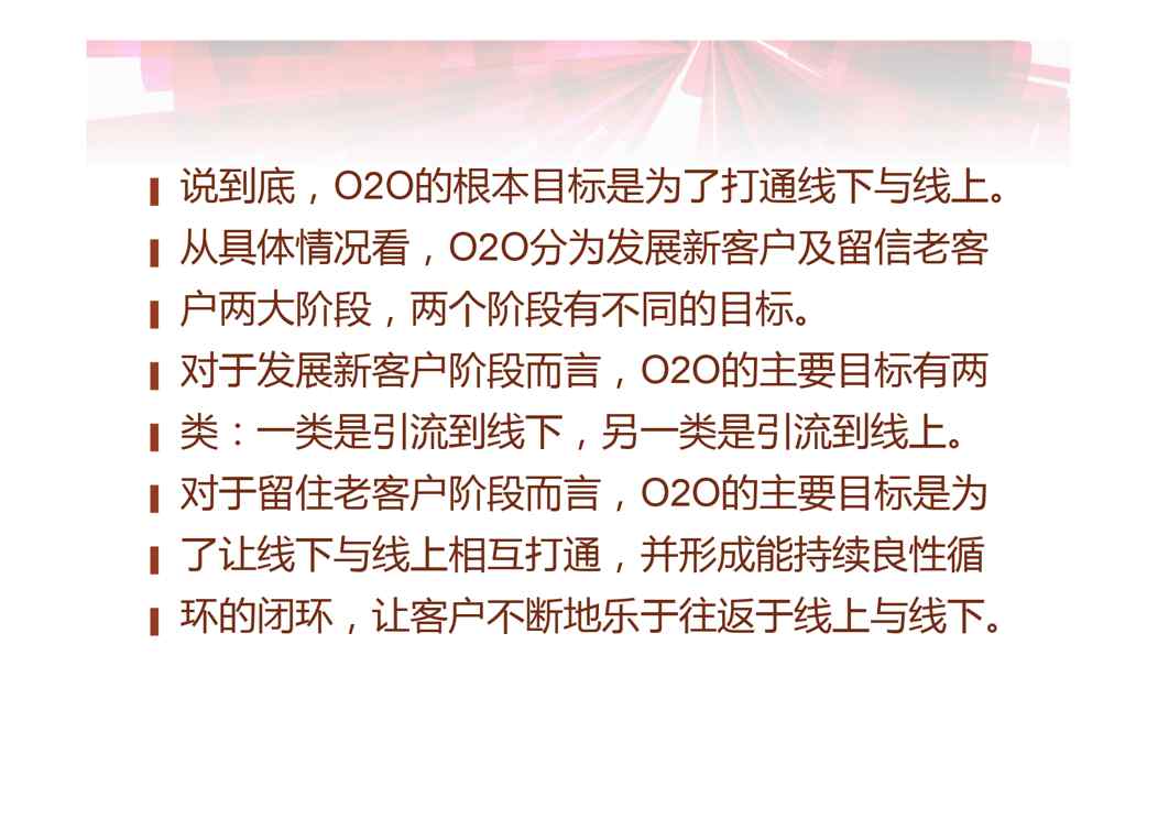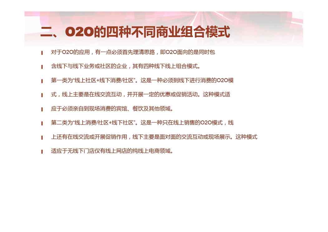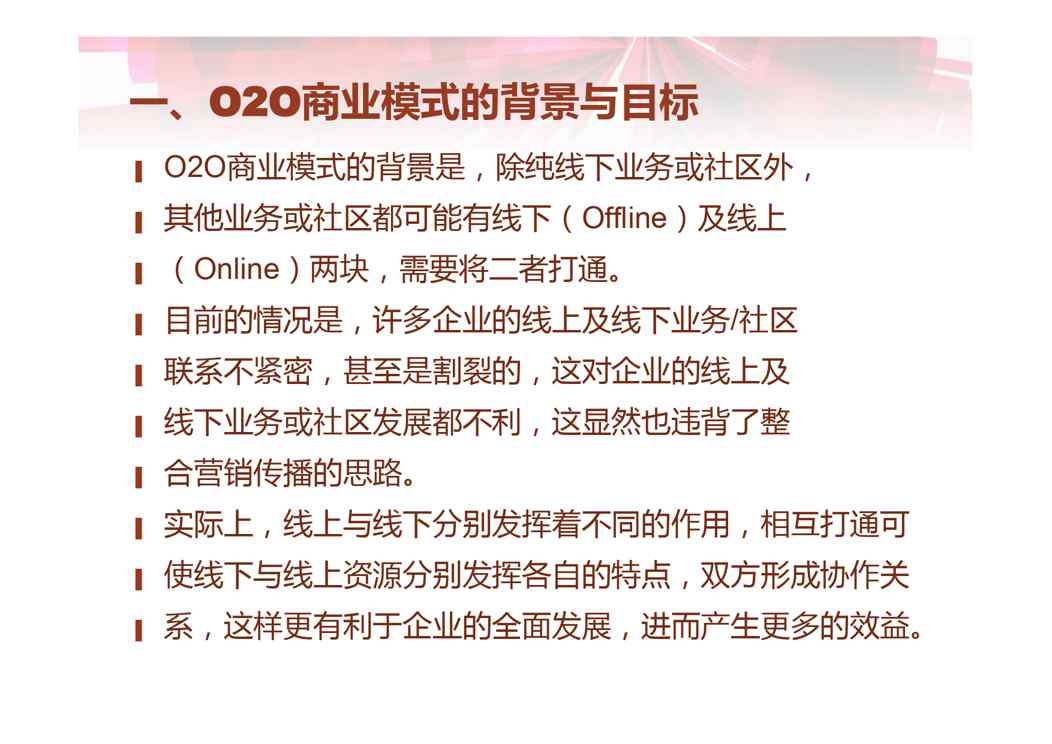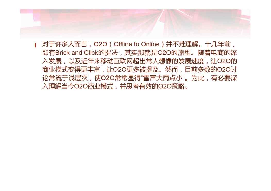 不久前,最新文档《O2O商业模式及策略深度解析》全文正式在本站发布,感兴趣的用户可以下载阅读。 声明:本站所有文章,如无特殊说明或标注,均为本站原创发布。任何个人或组织,在未征得本站同意时,禁止复制、盗用、采集、发布本站内容到任何网站、书籍等各类媒体平台。如若本站内容侵犯了原著者的合法权益,可联系我们进行处理。