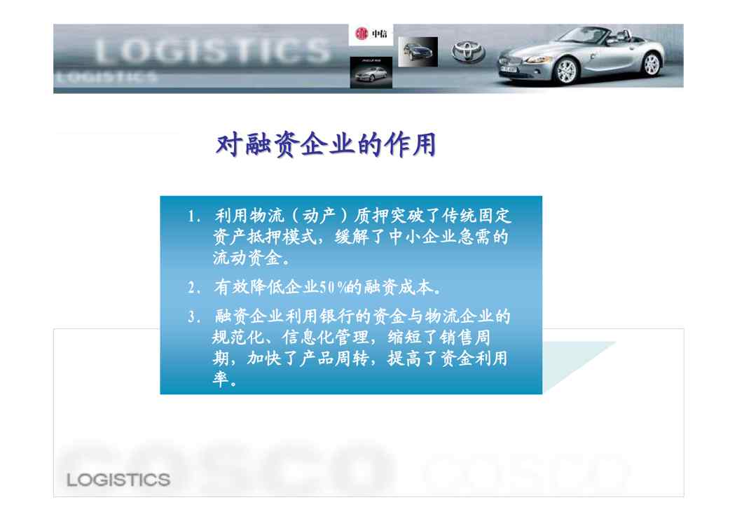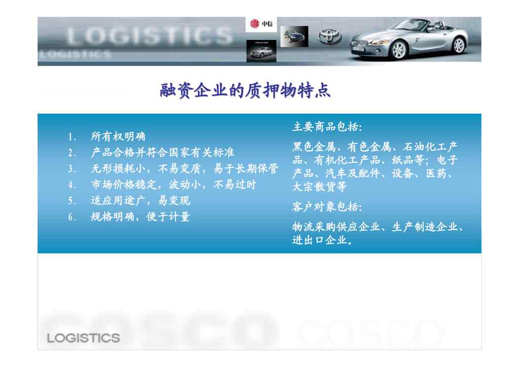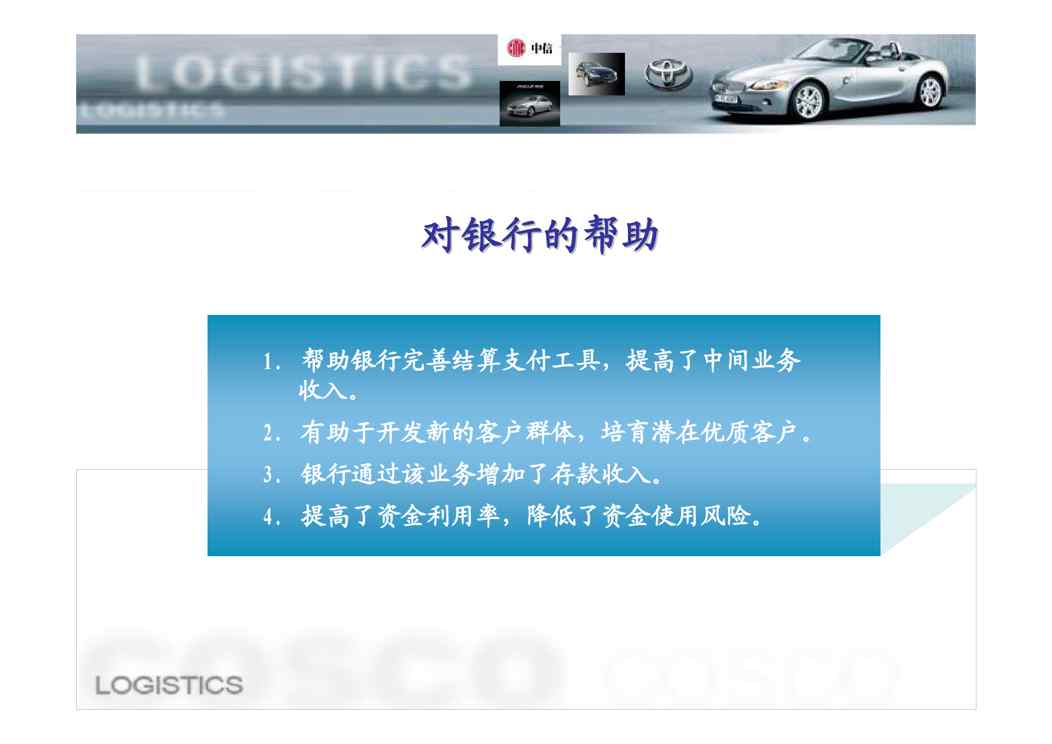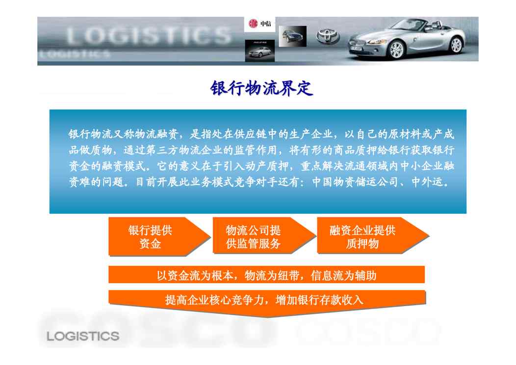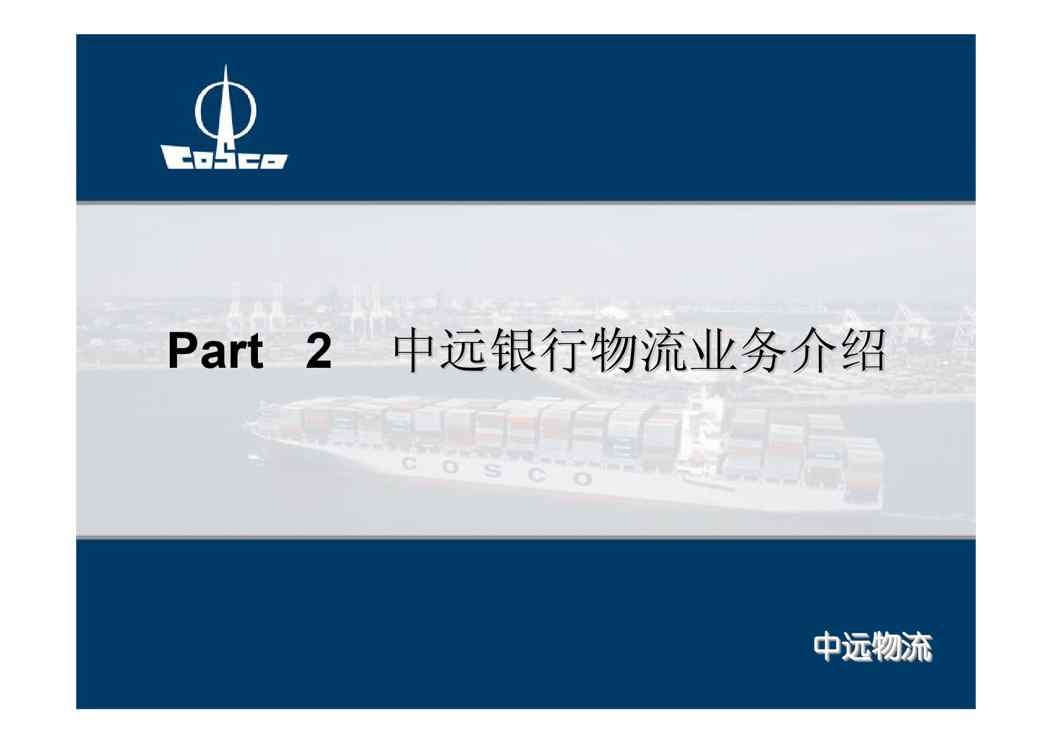 本站正式发布了《Part2中远银行物流业务介绍中远物流》文档,文档详细内容可下载阅读。 声明:本站所有文章,如无特殊说明或标注,均为本站原创发布。任何个人或组织,在未征得本站同意时,禁止复制、盗用、采集、发布本站内容到任何网站、书籍等各类媒体平台。如若本站内容侵犯了原著者的合法权益,可联系我们进行处理。
