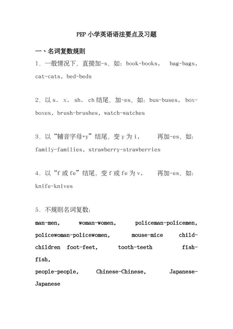 不久前,最新文档《PEP小学英语语法要点及习题》全文正式在本站发布,感兴趣的用户可以下载阅读。 声明:本站所有文章,如无特殊说明或标注,均为本站原创发布。任何个人或组织,在未征得本站同意时,禁止复制、盗用、采集、发布本站内容到任何网站、书籍等各类媒体平台。如若本站内容侵犯了原著者的合法权益,可联系我们进行处理。