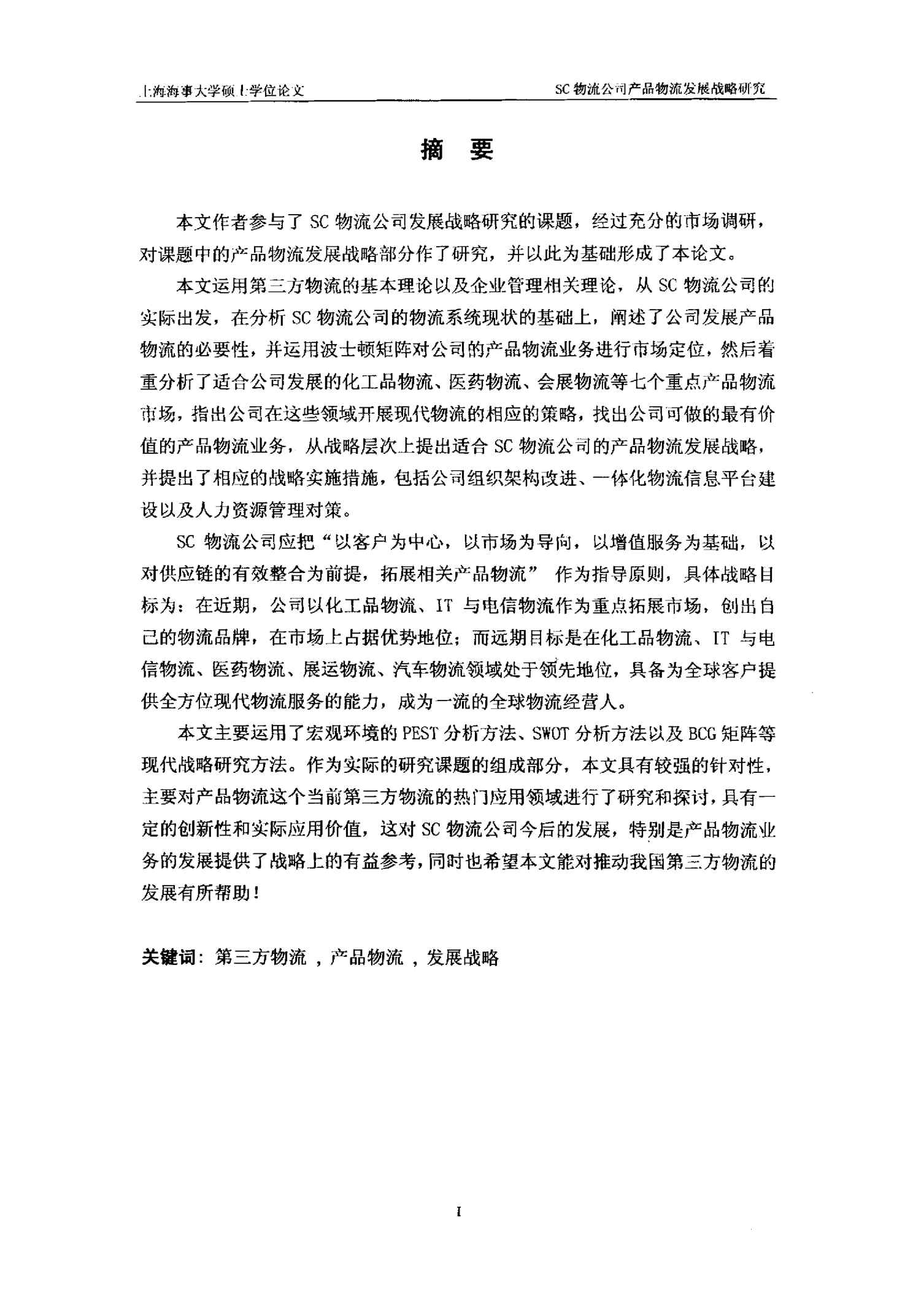 不久前,最新文档《SC物流公司产品物流发展战略研究》全文正式在本站发布,感兴趣的用户可以下载阅读。 声明:本站所有文章,如无特殊说明或标注,均为本站原创发布。任何个人或组织,在未征得本站同意时,禁止复制、盗用、采集、发布本站内容到任何网站、书籍等各类媒体平台。如若本站内容侵犯了原著者的合法权益,可联系我们进行处理。